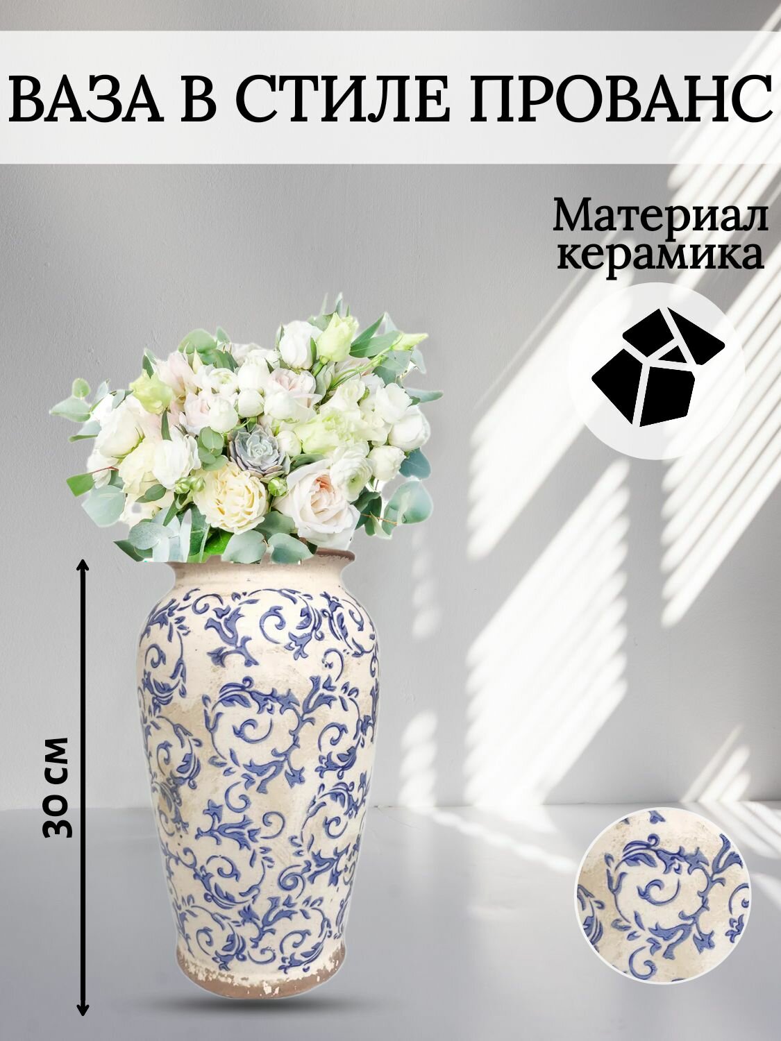 Купить Ваза керамическая винтажная в стиле прованс / Ваза декоративная с узором для цветов/ Оригинальная ваза для декора интерьера / Красивый сувенир в подарок маме, бабушке, сестре, родителям, подруге на 8 марта, день рождения, юбилей, годовщину / Высота 30 см
