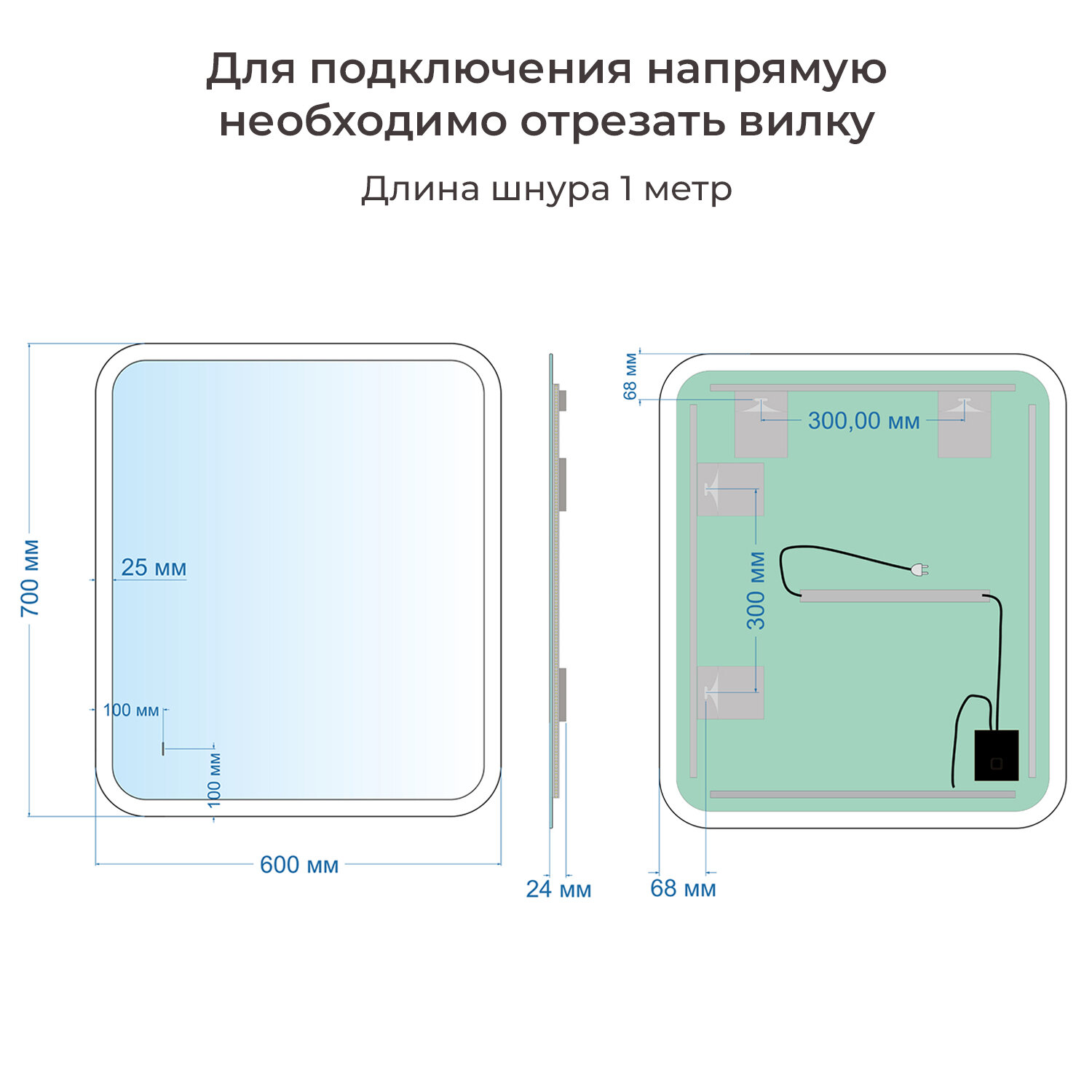 Зеркало настенное для ванной КерамаМане 70*100 см с холодной подсветкой 6000 К с сенсорной кнопкой
