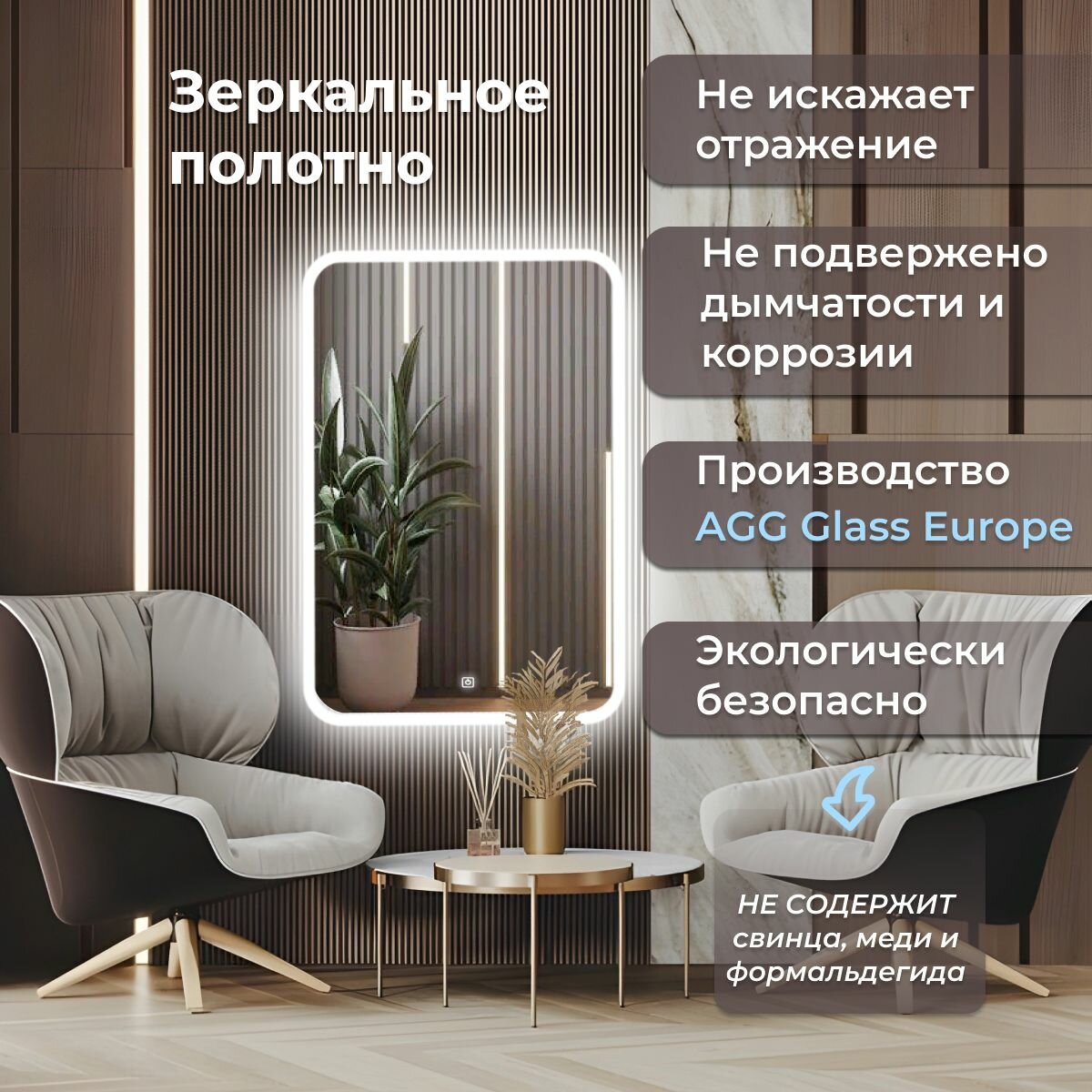 Зеркало настенное Иллюзия с фоновой LED-подсветкой, фронтальной подсветкой и сенсорным выключателем для ванной 60х80