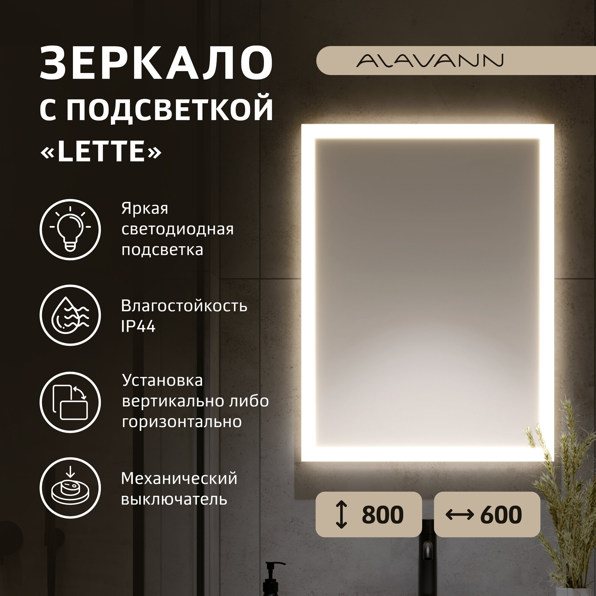 Купить Зеркало с подсветкой Alavann Lette 60x80 см, с LED подсветкой, механической кнопкой, вертикальное или горизонтальное крепление
