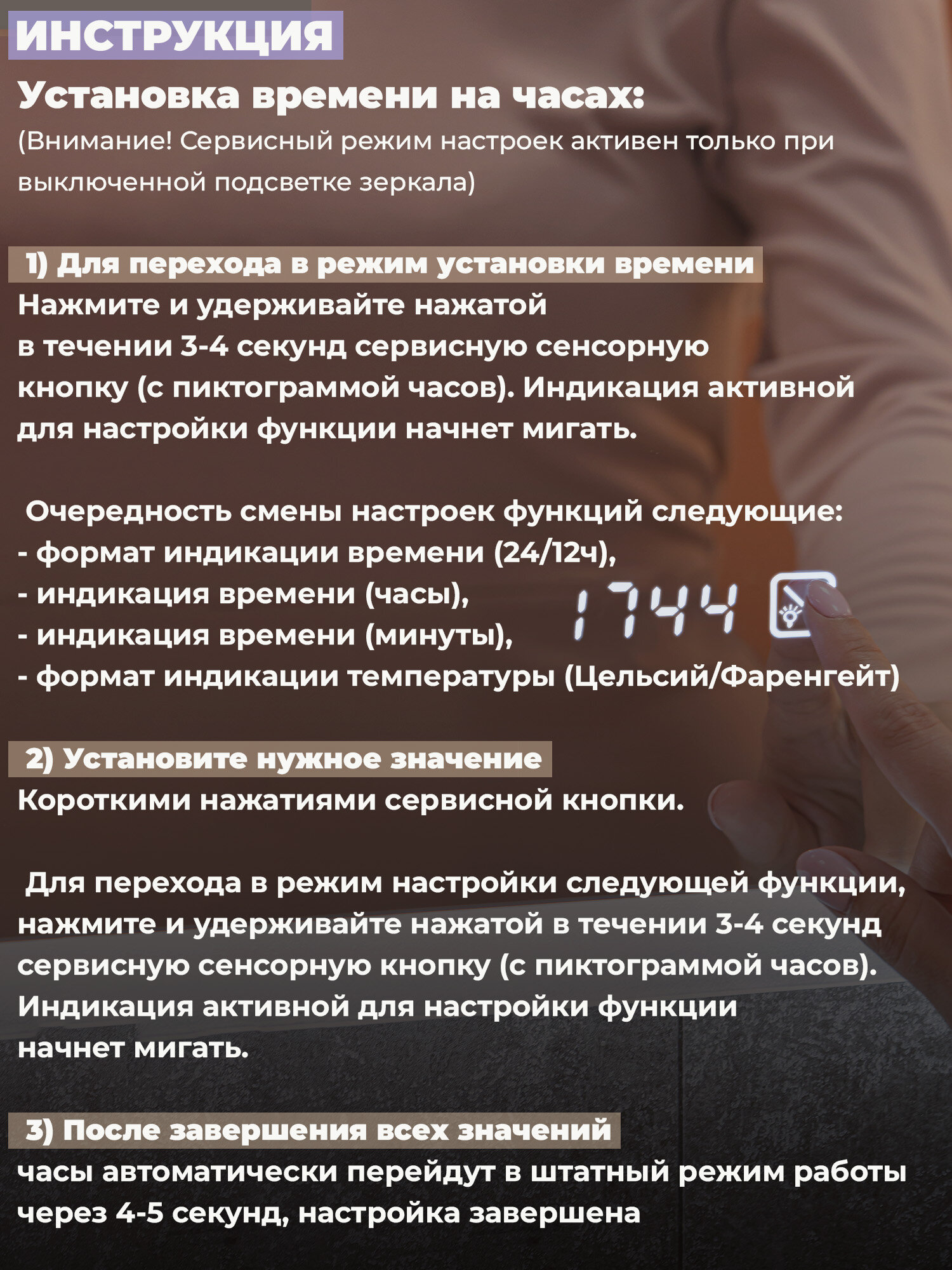 | Особенности | подсветка, регулировка яркости подсветки, с часами, сенсорный выключатель подсветки |
