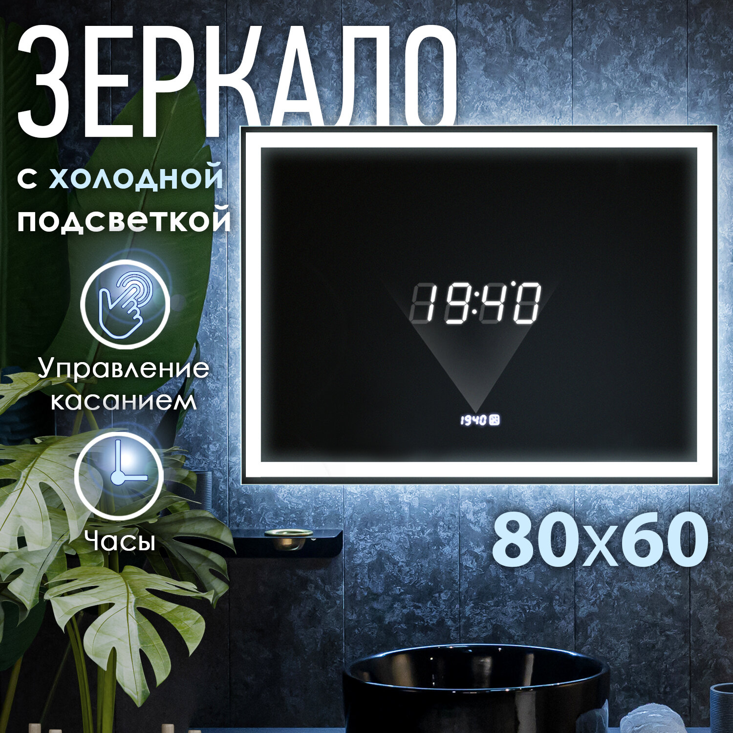 Зеркало с LED подсветкой OBERIAL - 4 80x60см (холодный свет 6000К, прямоугольное настенное для ванной сенсорное выключение) интересное: