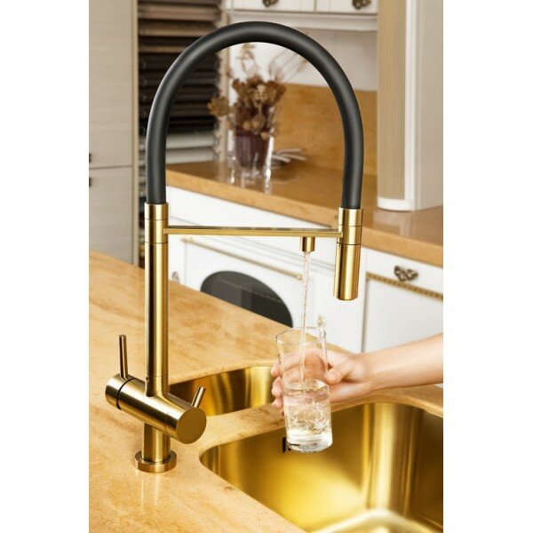 Смеситель для кухни OMOIKIRI Kanto-PVD-LG с подключением фильтра и гибким изливом / светлое золото / черный шланг