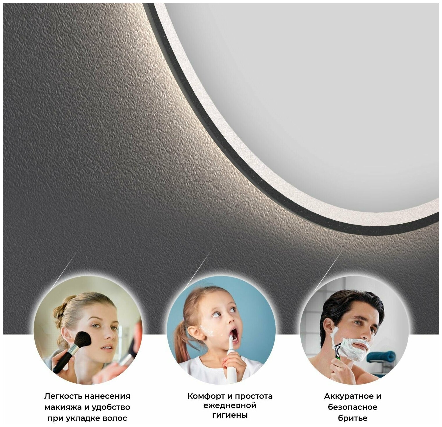 | Особенности | без рамы, без увеличения, подсветка, регулировка яркости подсветки, сенсорный выключатель подсветки |