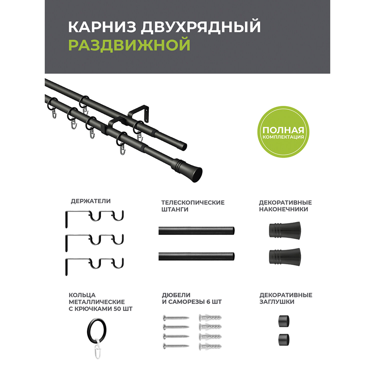 Карниз настенный металлический двухрядный раздвижной 160-300 см d16/19 мм черный (151.211)