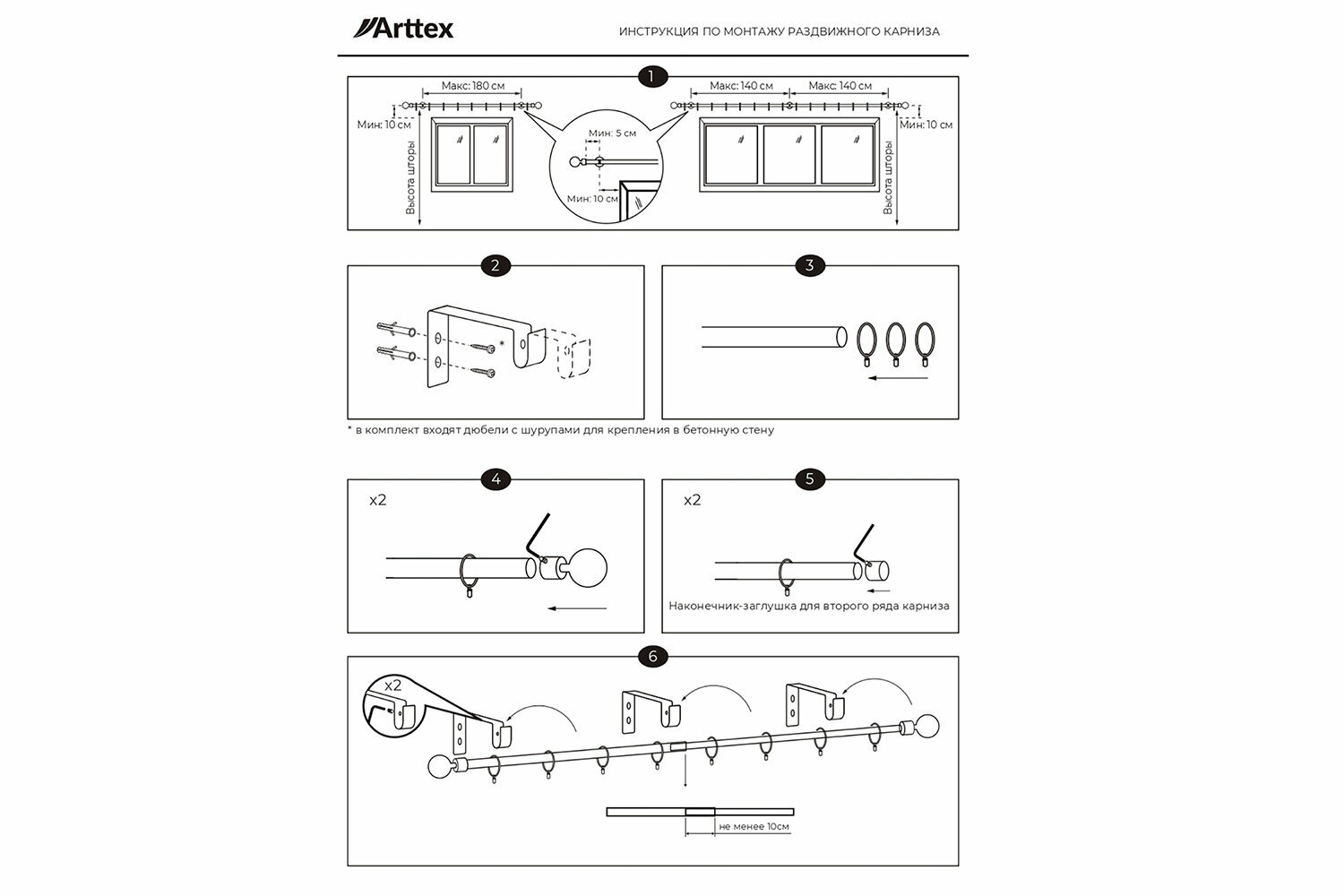 | Комплектация | Направляющая раздвижная - 2 шт, декоративные наконечники - 2 шт, заглушки - 2 шт, держатели - 3 шт, кольца с крючками - 50 шт, шурупы с дюбелями - 6 шт. |