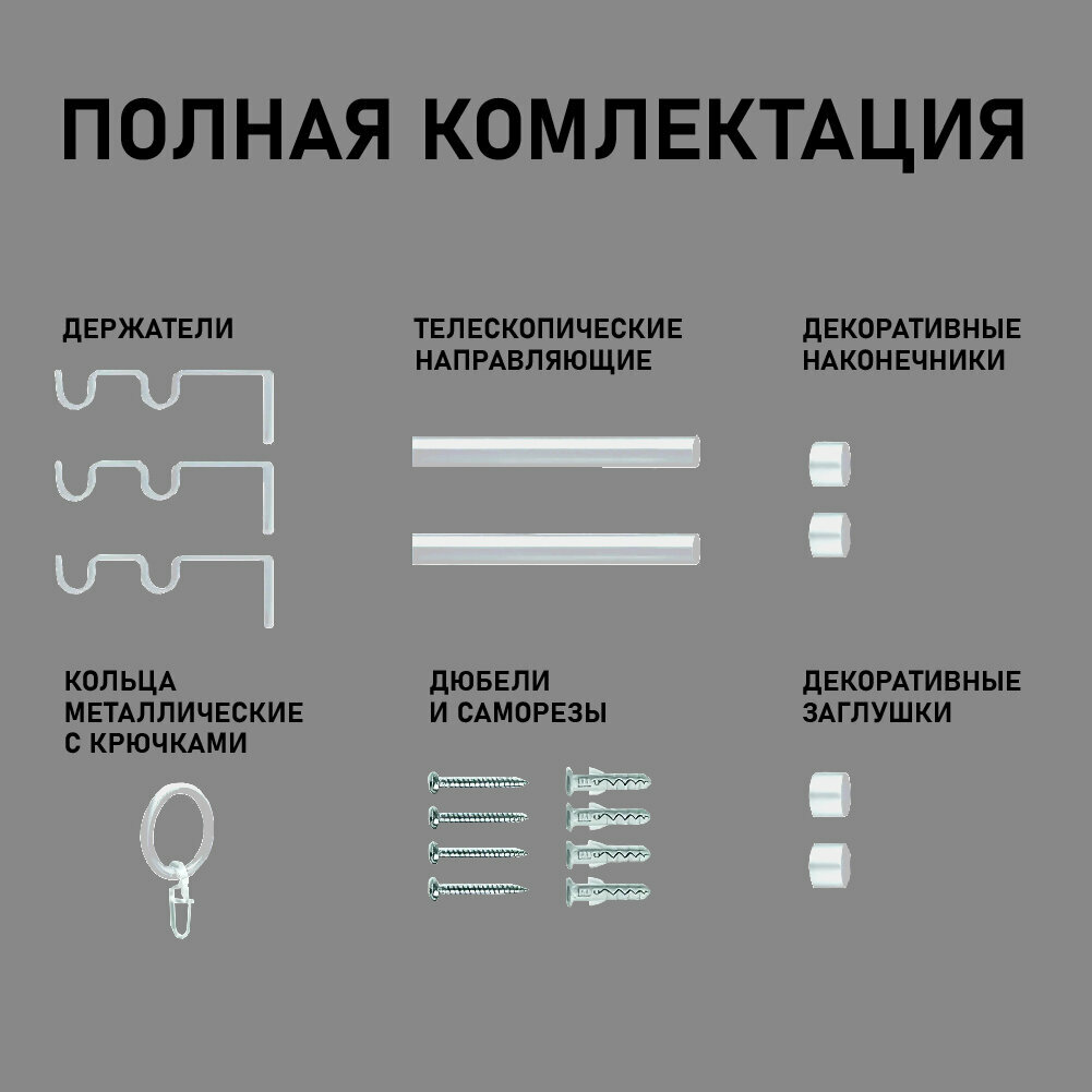 | Комплектация | 2 раздвижных направляющих, 3 двухрядных держателя, 2 декоративных наконечника, 2 наконечника-заглушки, 60 колец с крючками, 4 пластиковых втулки-переходника, 6 шурупов, 6 дюбелей |