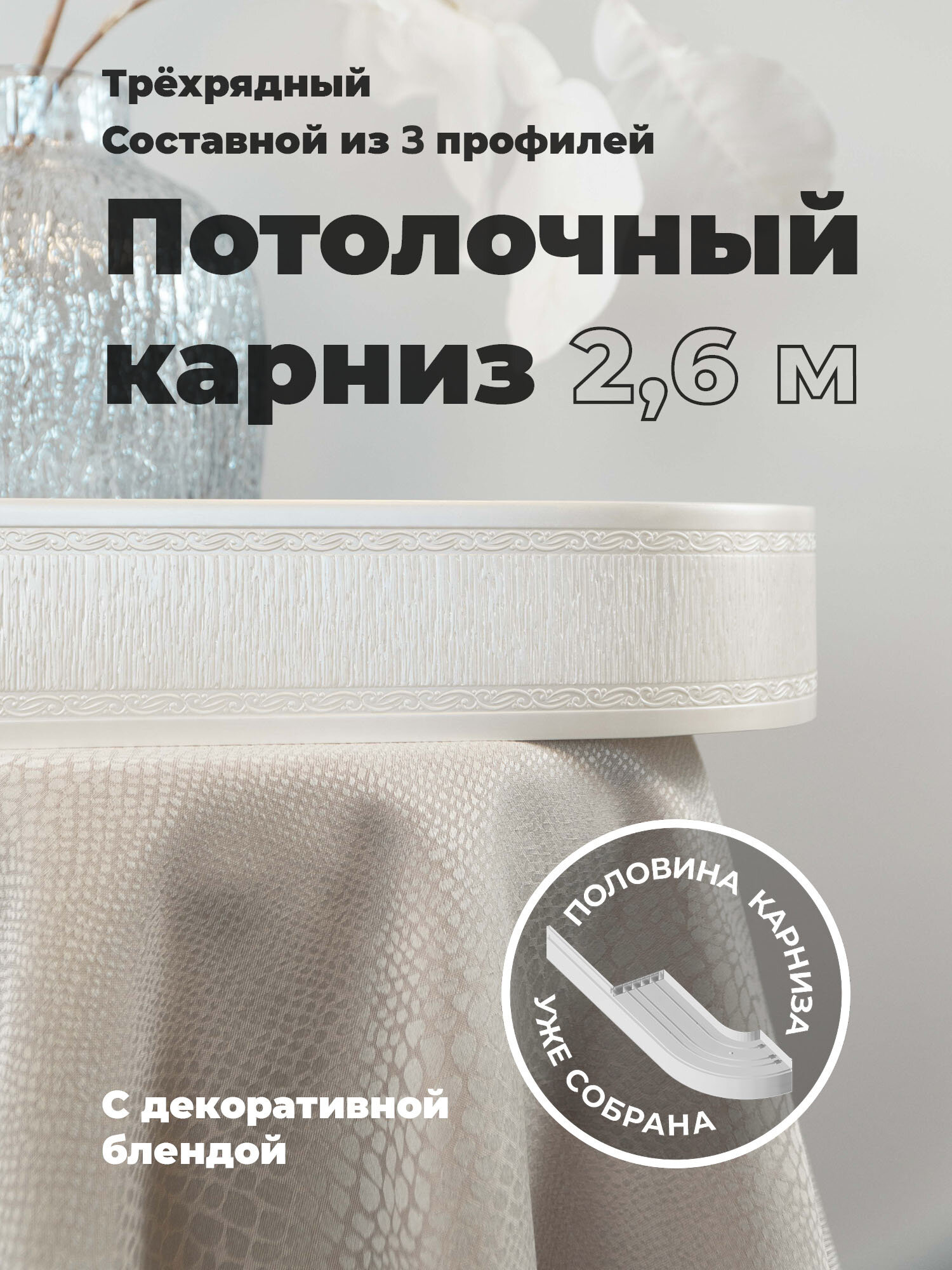 | Комплектация | профиль потолочный 3-х рядный; Бленда – 1 шт, угловые элементы 14,5*12,5 см - 2 шт; крючки для штор роликовые ; соединитель - переходник - 2 шт, стопор - 6 шт, комплект крепежей; подробная инструкция по сборке |