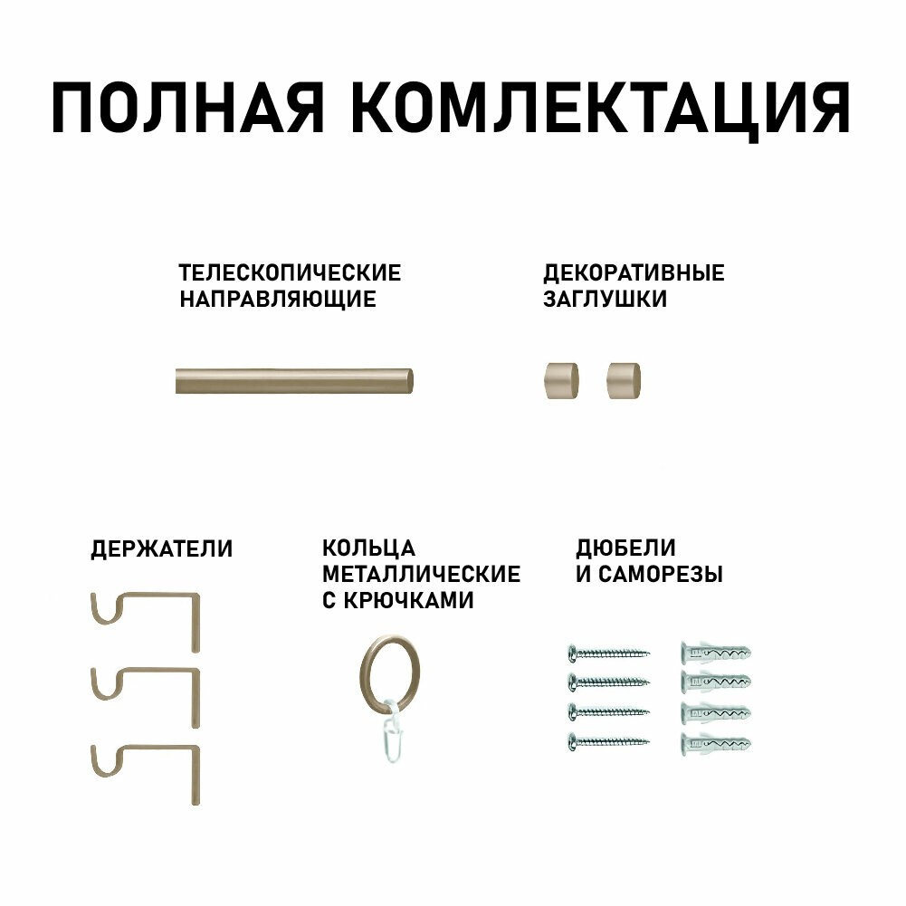 | Комплектация | 1 раздвижная направляющая, 3 однорядных держателя, 2 декоративных наконечника, 30 колец с крючками, 2 пластиковых втулки-переходника, 6 шурупов, 6 дюбелей |