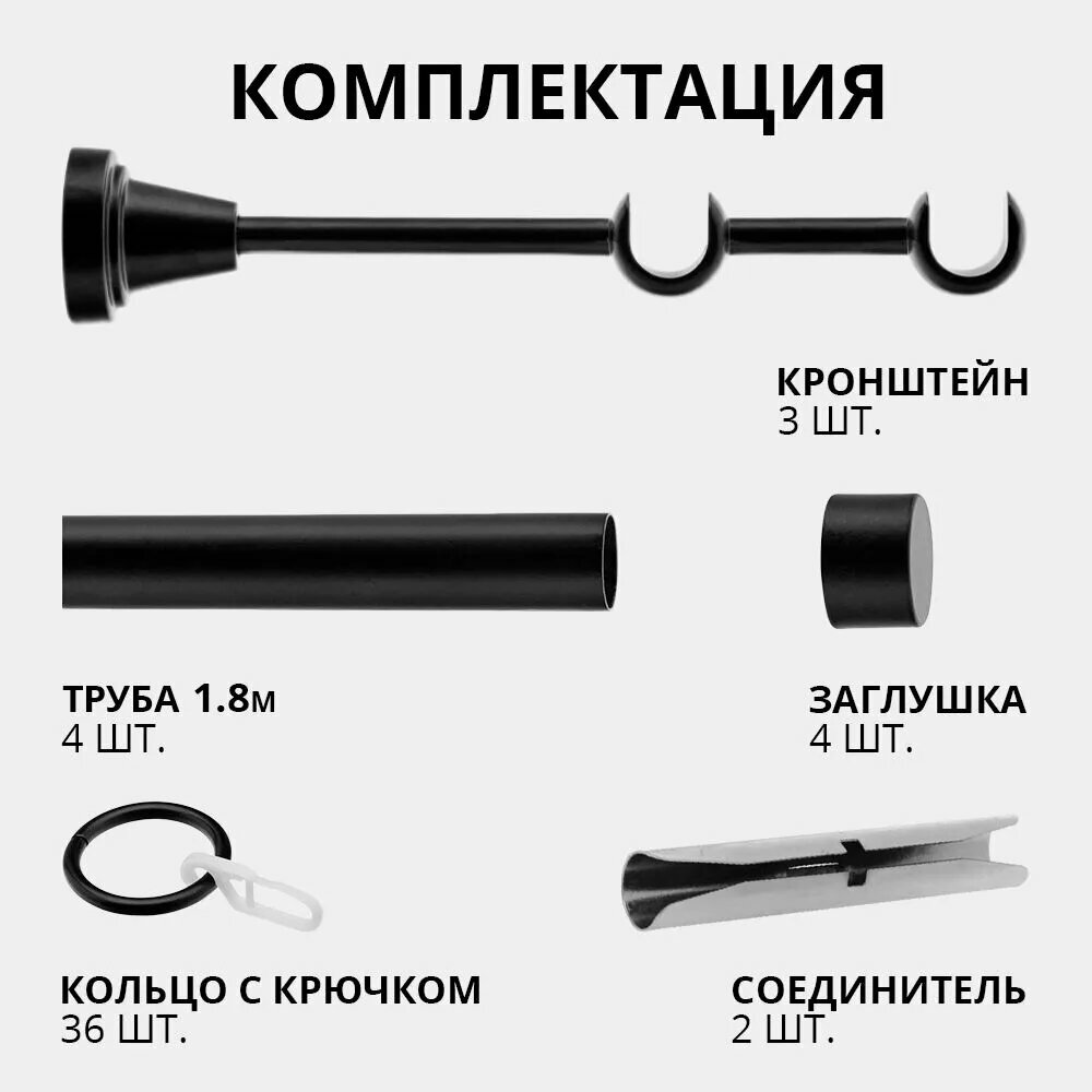 | Комплектация | труба для карниза 1,5м 4 шт, кронштейн для карниза 3 шт, наконечник для карниза заглушка 4 шт, соединитель для карниза 2 шт, кольца для штор с крючками 30 шт |