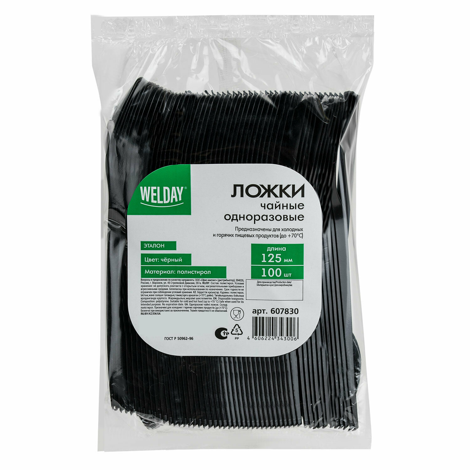 Ложка чайная одноразовая пластиковая 125мм, черн, комплект 100шт, эталон, белый аист/WELDAY, 607830