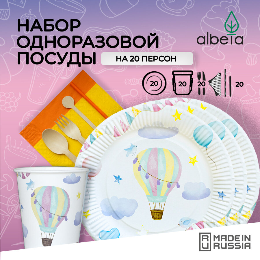 Одноразовая посуда для праздника детская (тарелки, стаканчики, вилки, ложки) набор на 20 персон, принт "Воздушный шар"