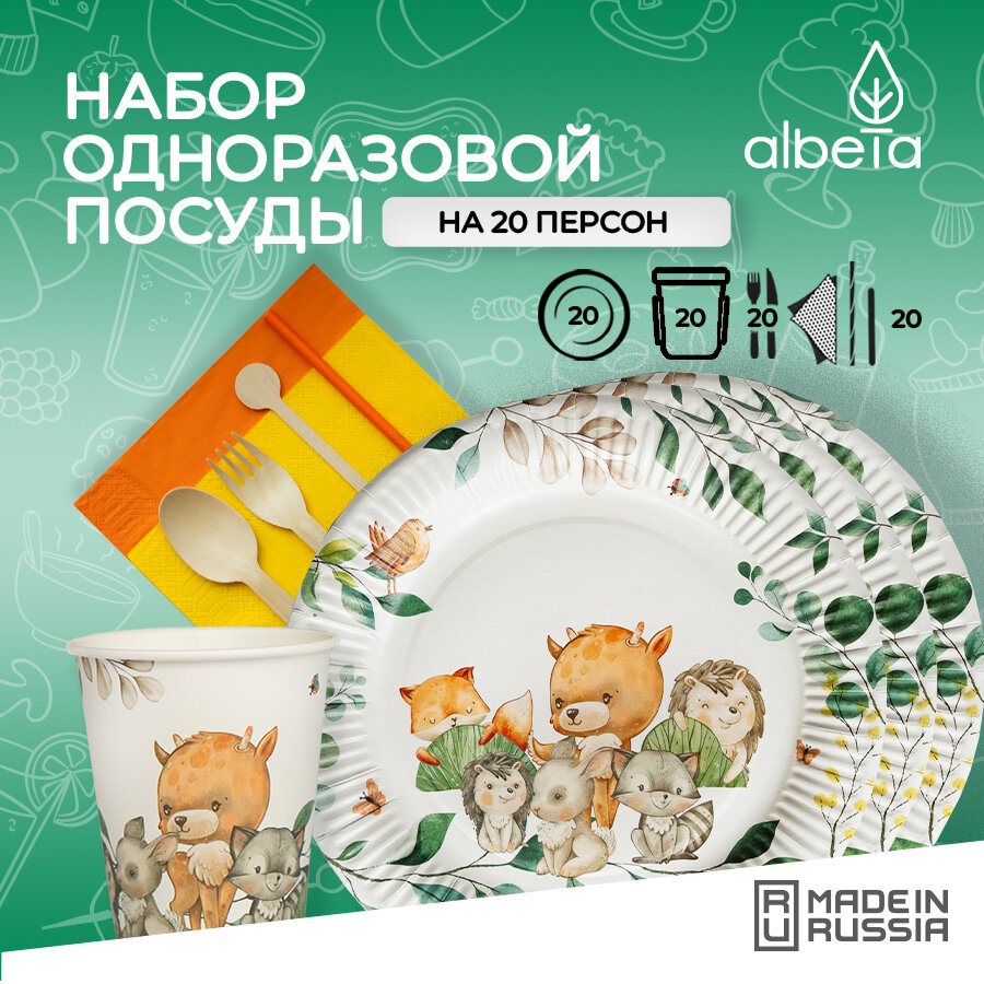 Одноразовая посуда для праздника детская (тарелки, стаканчики, вилки, ложки) набор на 20 персон, принт "Лесные звери"
