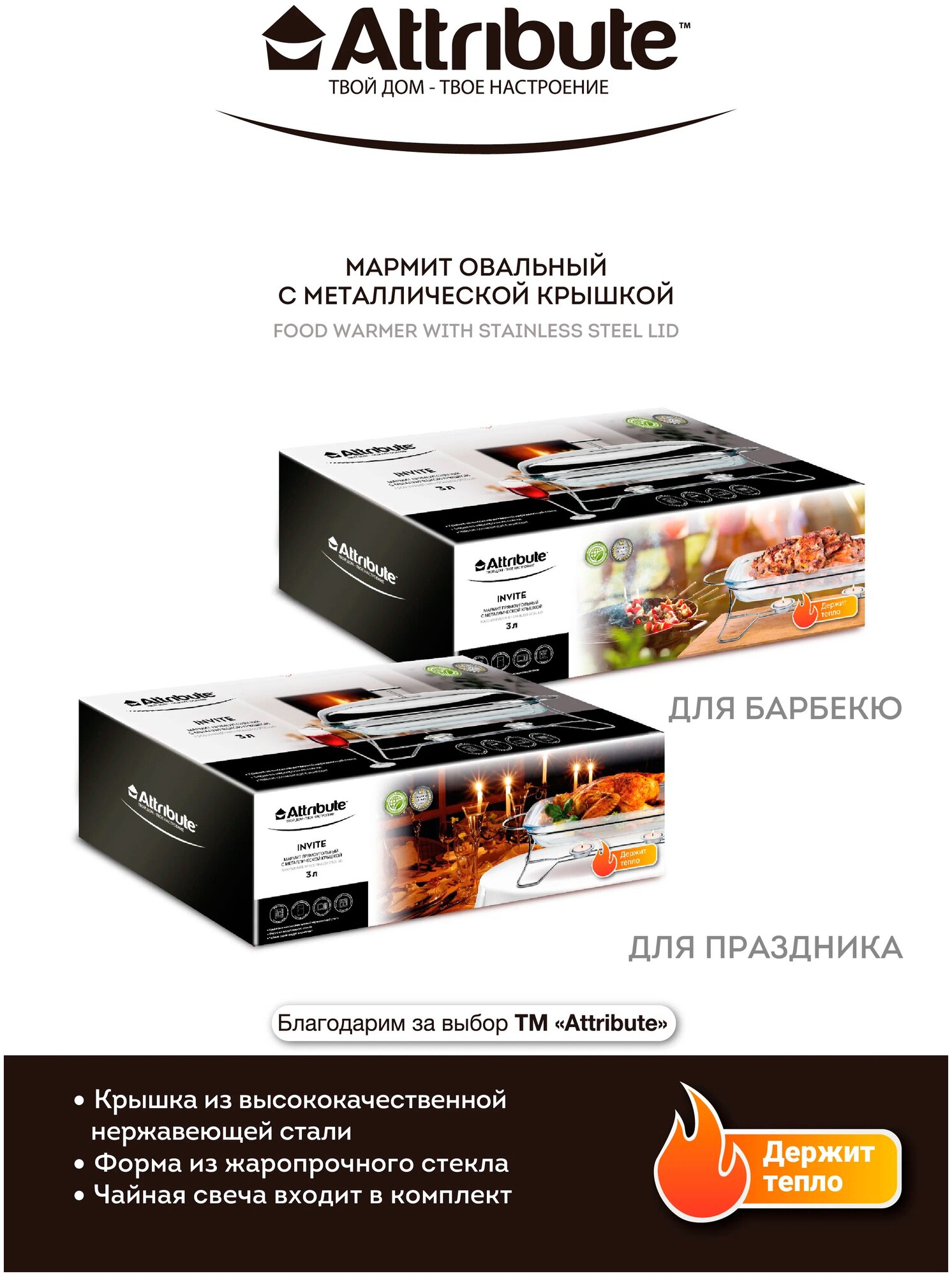Мармит со свечой для подогрева Attribute INVITE 3л 49х24х18см прямоугольный