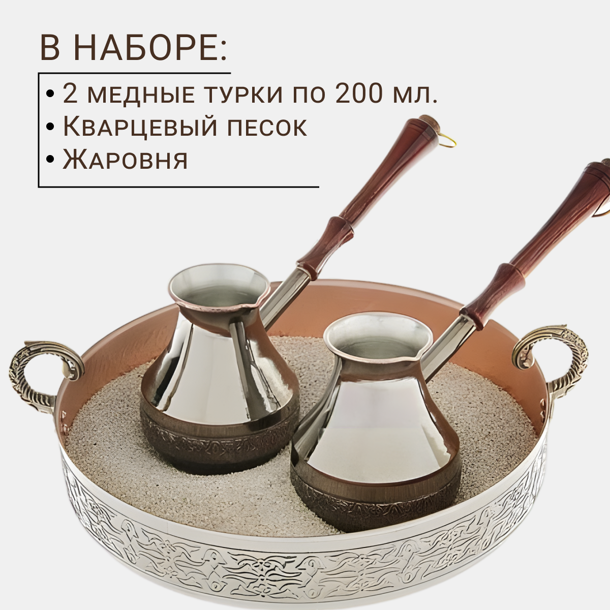 | Комплектация | 2 медные турки по 200 мл., медная жаровня диаметром 18 см., кварцевый песок |