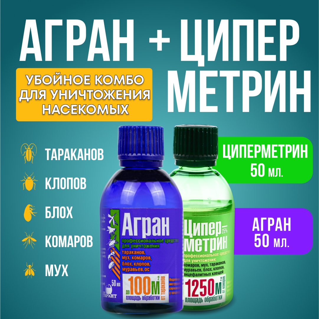 Агран + Циперметрин 25. Набор средств от клопов, тараканов, блох, муравьев, мух, ос. Флаконы по 50 мл интересное: