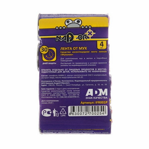 | Способ применения | медленно, не применяя больших усилий, вытянуть ленту за петлю из футляра, слегка вращая ленту и футляр в противоположных направлениях, разместить в местах скопления насекомых, избегая сквозняков и прямых солнечных лучей |
