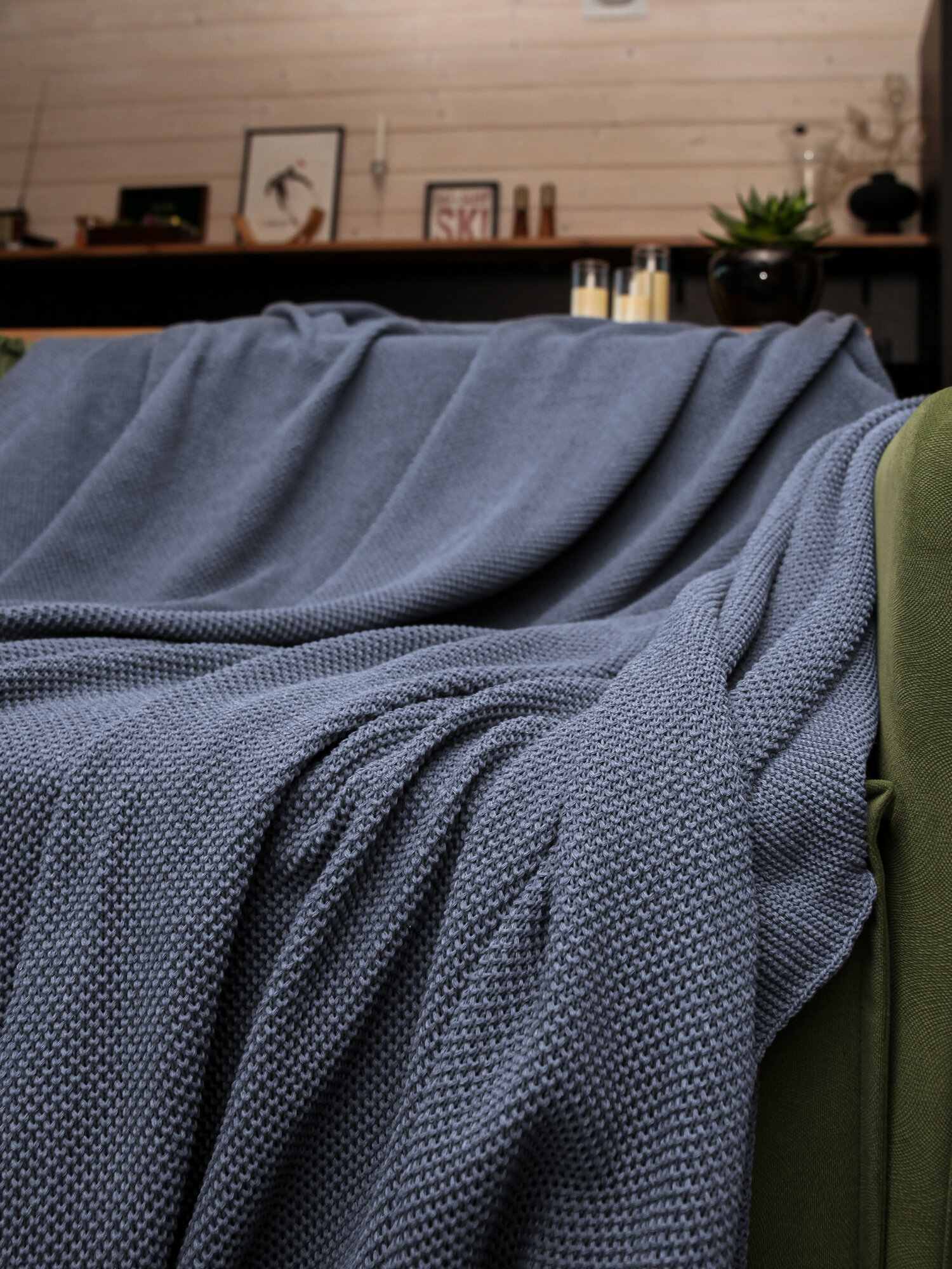 СохранитьПлед 200х220, вязаный, KING PLAID, джинсовый, хлопок 100%, покрывало на кровать, на диван, на кресло, большой, тонкий, в подарочной сумке интересное: