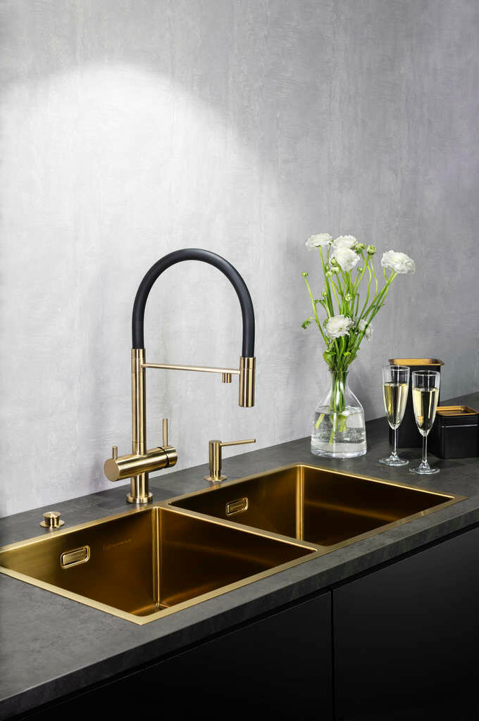 Смесители для кухни Omoikiri Kanto-PVD-LG, смеситель, светлое золото/черный гибкий шланг