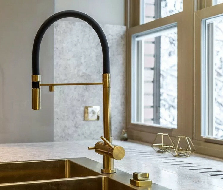 Смеситель для кухни Omoikiri Kanto-PVD-LG с выдвижным изливом, кран питьевой воды, светлое золото, чёрный 4994014