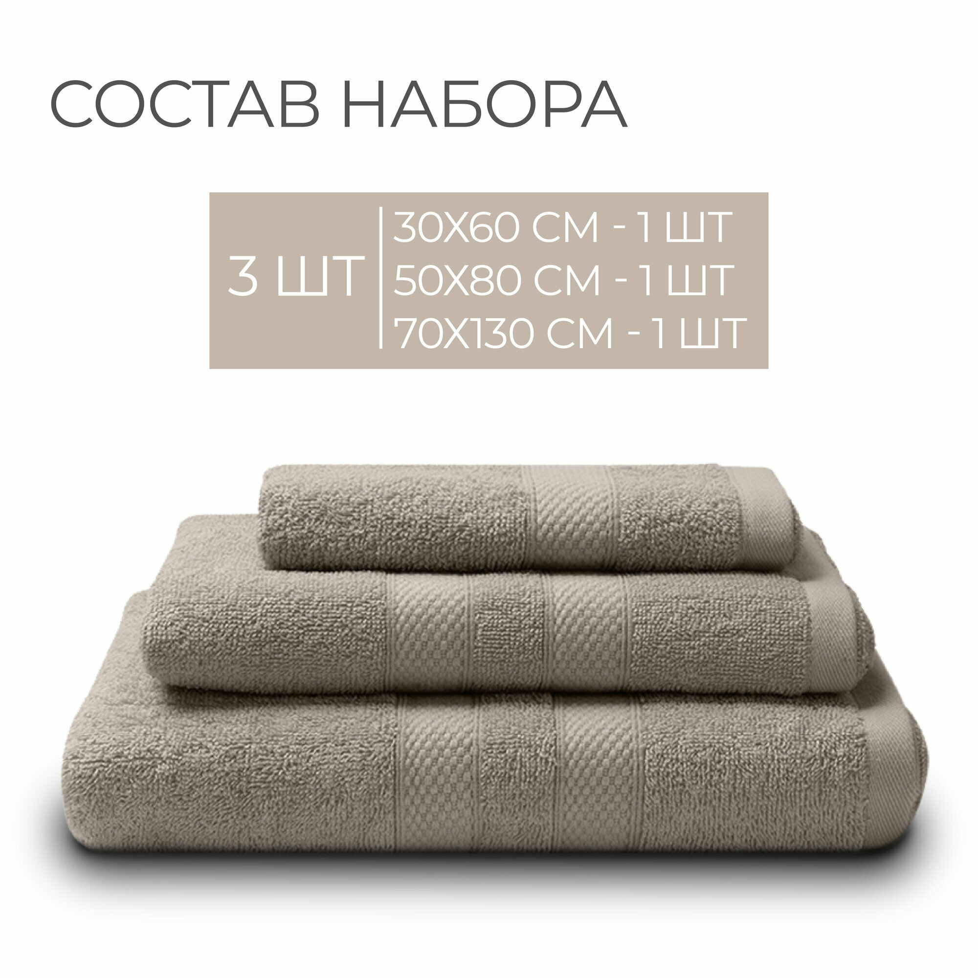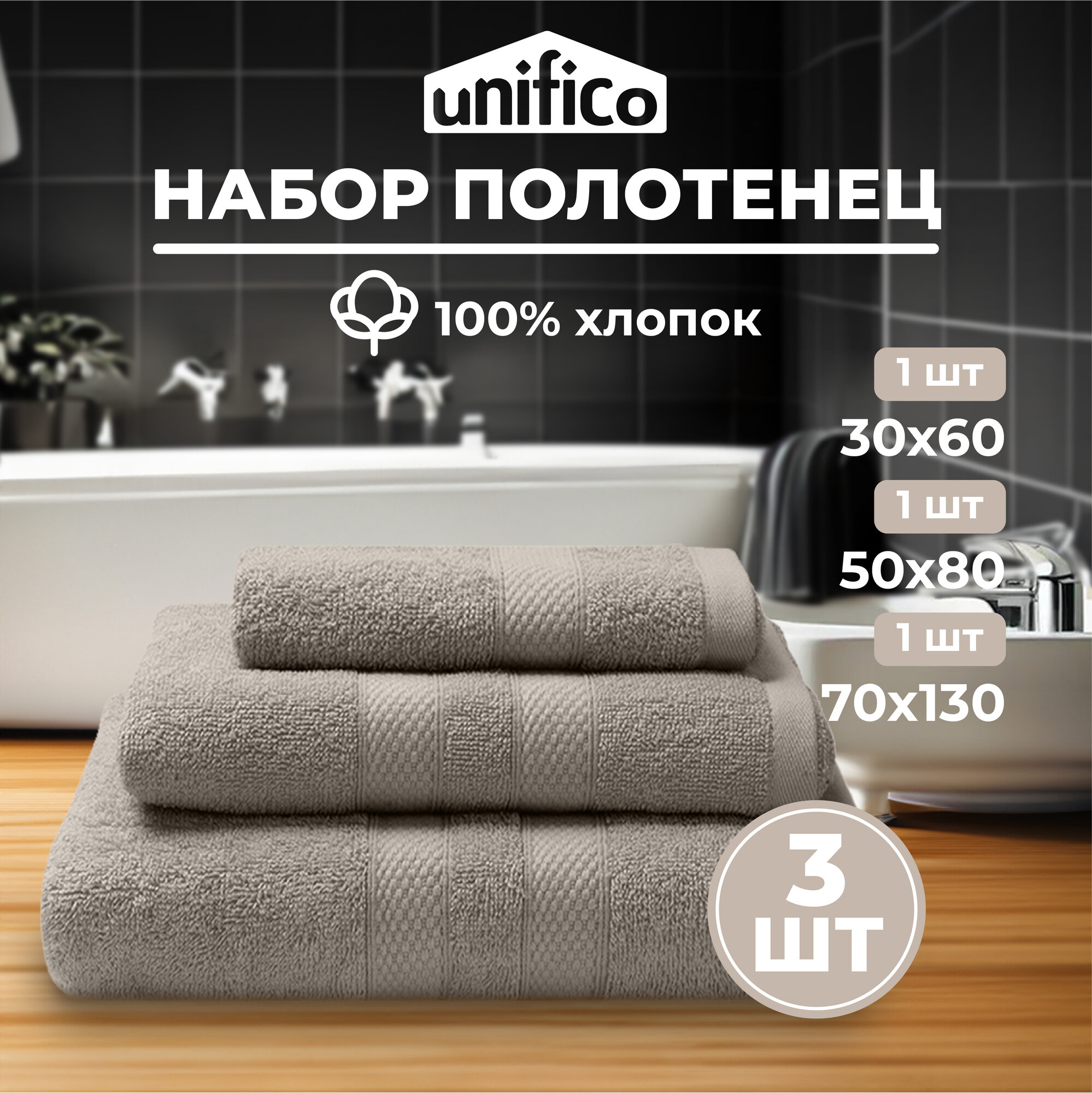 Полотенца махровые Unifico Nature светло-серый, набор из 3 шт.:30х60-1, 50х80-1,70х130-1