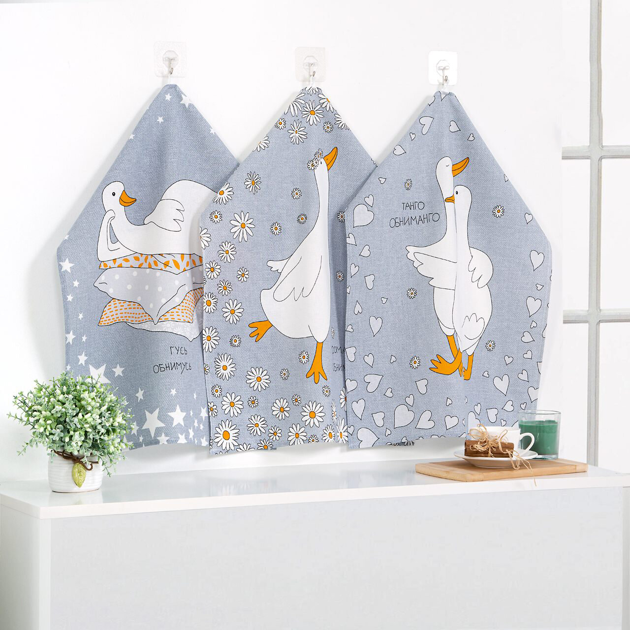 Купить Набор кухонных полотенец «Обниманго» - Гуси-обнимуси из рогожки (3шт - 45*60см), АртПостель, гусь, хлопок