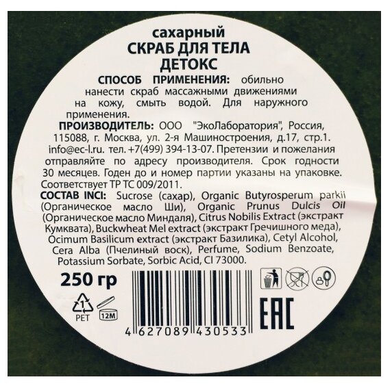 Купить гринкосм._eco lab._скраб д/тела сахар. детокс 250гр 949016
