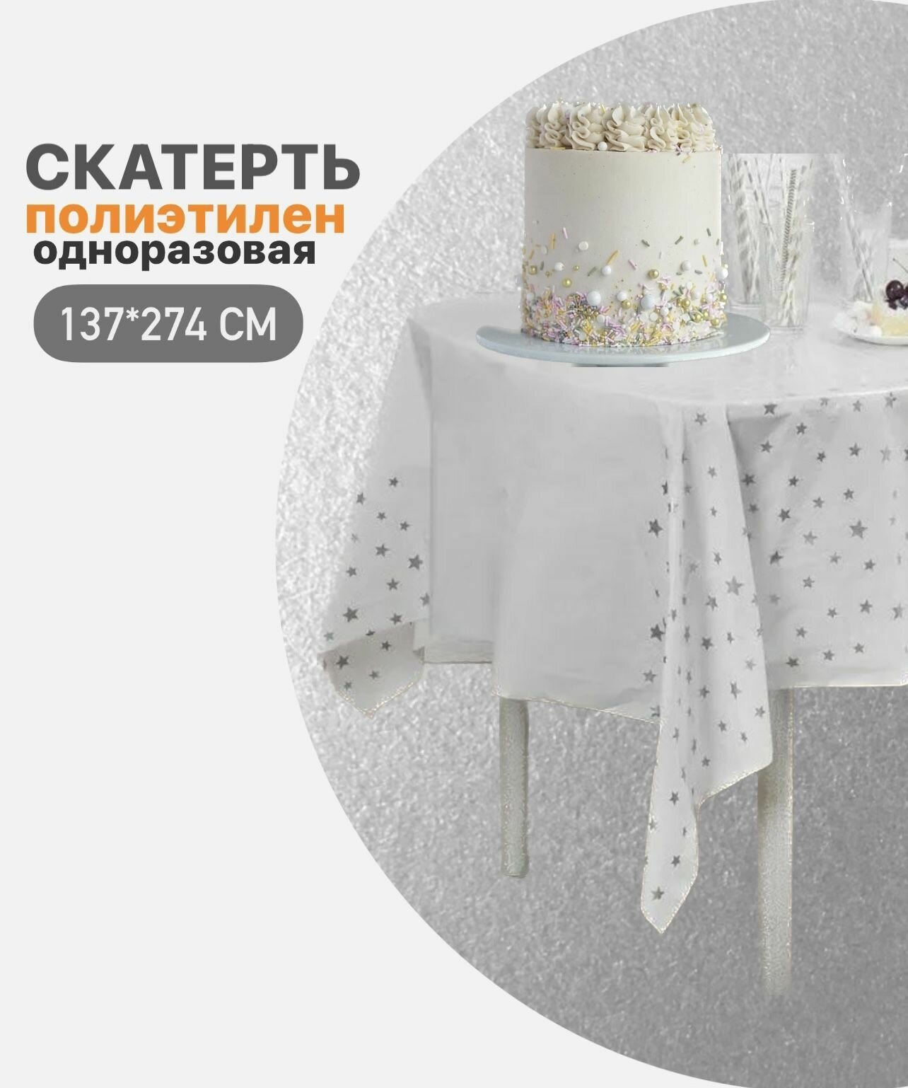 Скатерть праздничная одноразовая полиэтиленовая для праздника Звезды серебристые/серебряные металлик, белая, 137х183 см