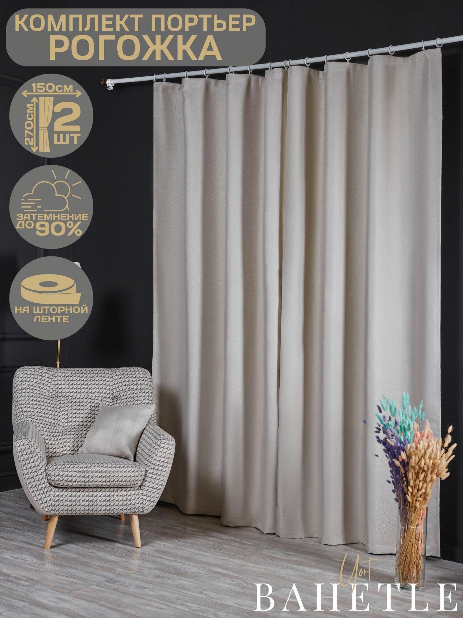 Комплект штор Bahetle из Рогожки 150х250 см 2 шт на ленте, готовые однотонные портьеры димаут от солнца для спальни, детской, дачи, гостиной бежевые