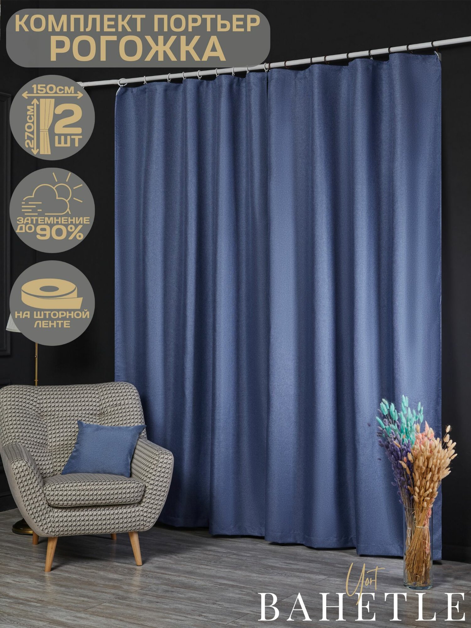 Комплект штор Bahetle из Рогожки 150х250 см 2 шт на ленте, готовые однотонные портьеры димаут от солнца для спальни, детской, дачи, гостиной синие