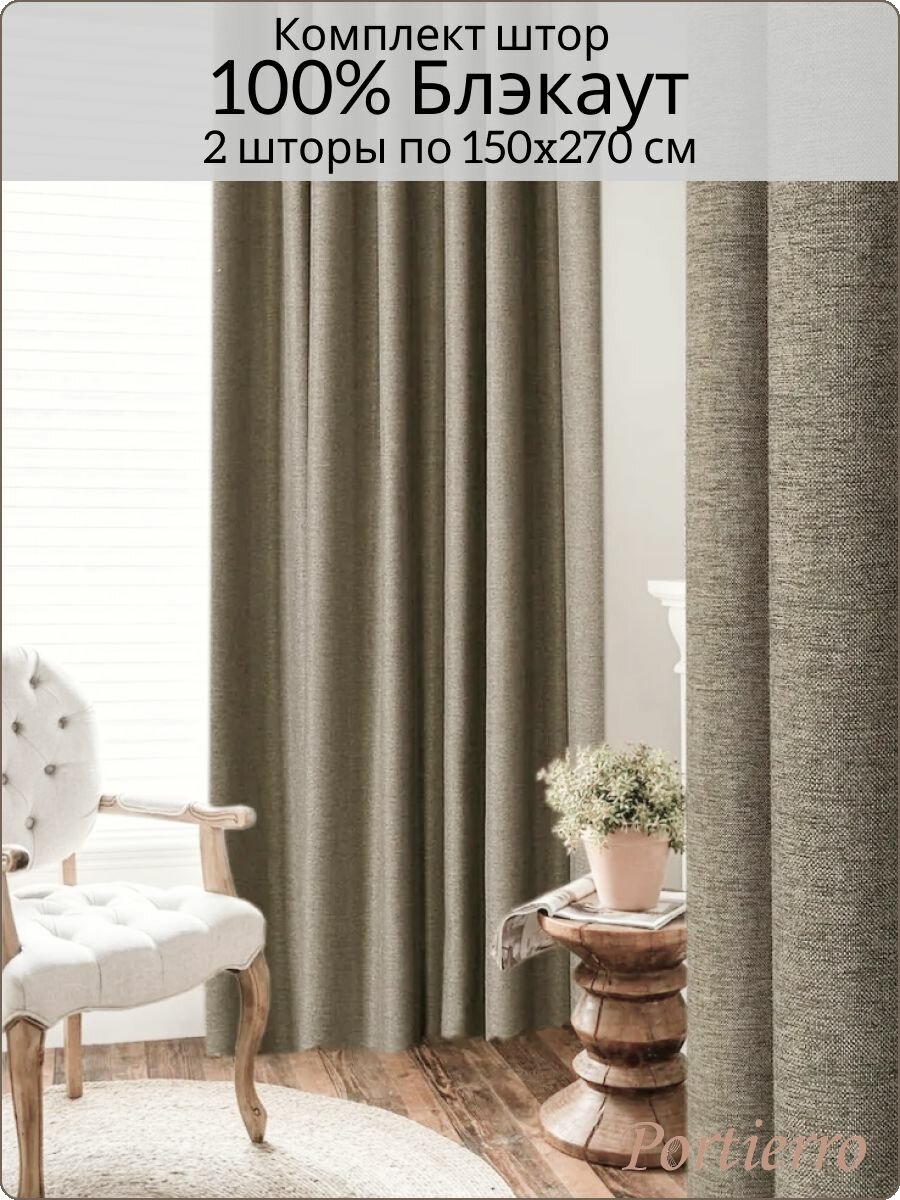 Комплект блэкаут портьерных штор 300x270 см, 2 штуки, рогожка, цвет: серо-коричневый, меланж