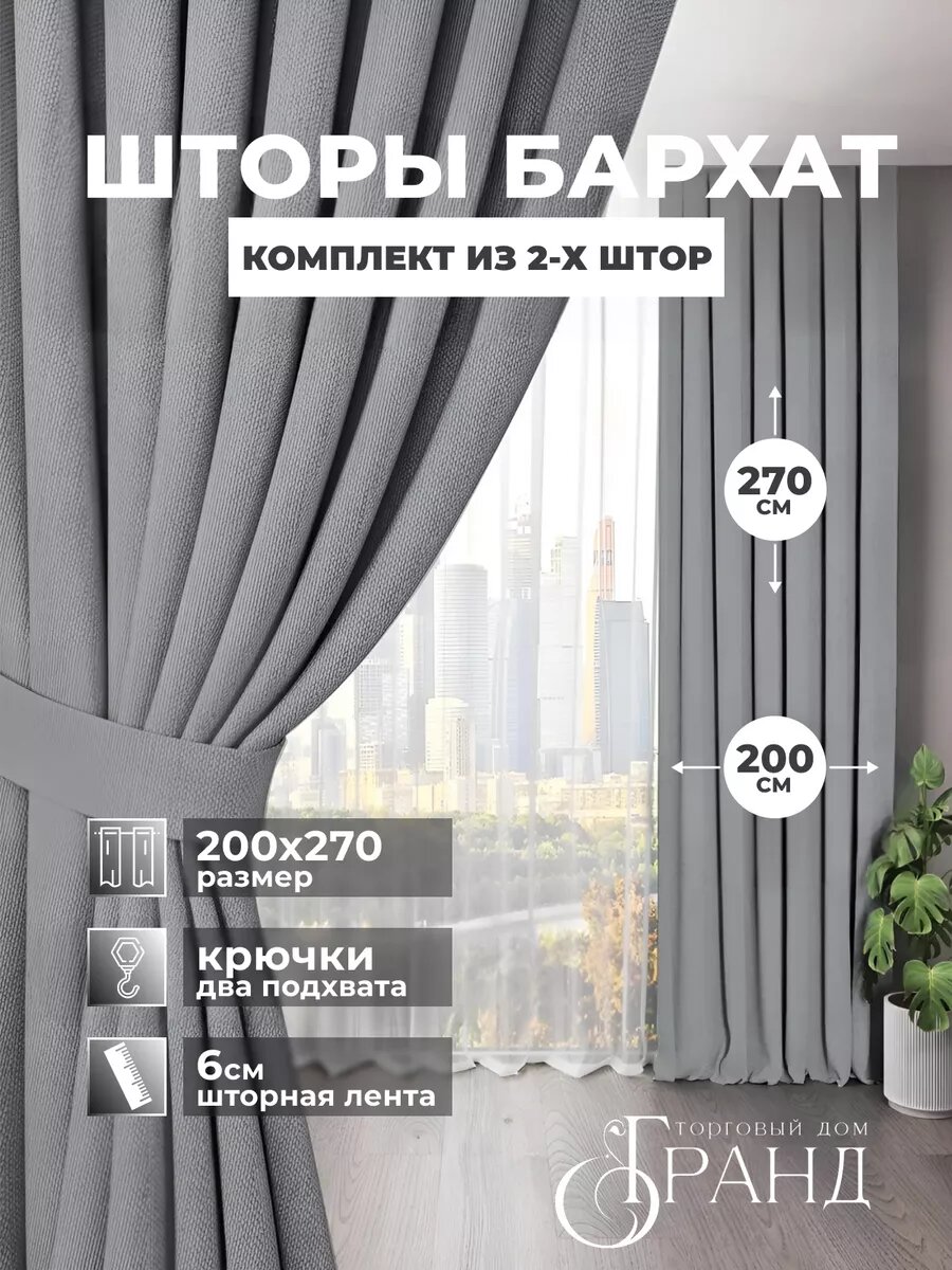 Шторы Торговый дом Гранд, 150Х270 см - 2шт, бархатные, с подхватами, для гостиной и спальни