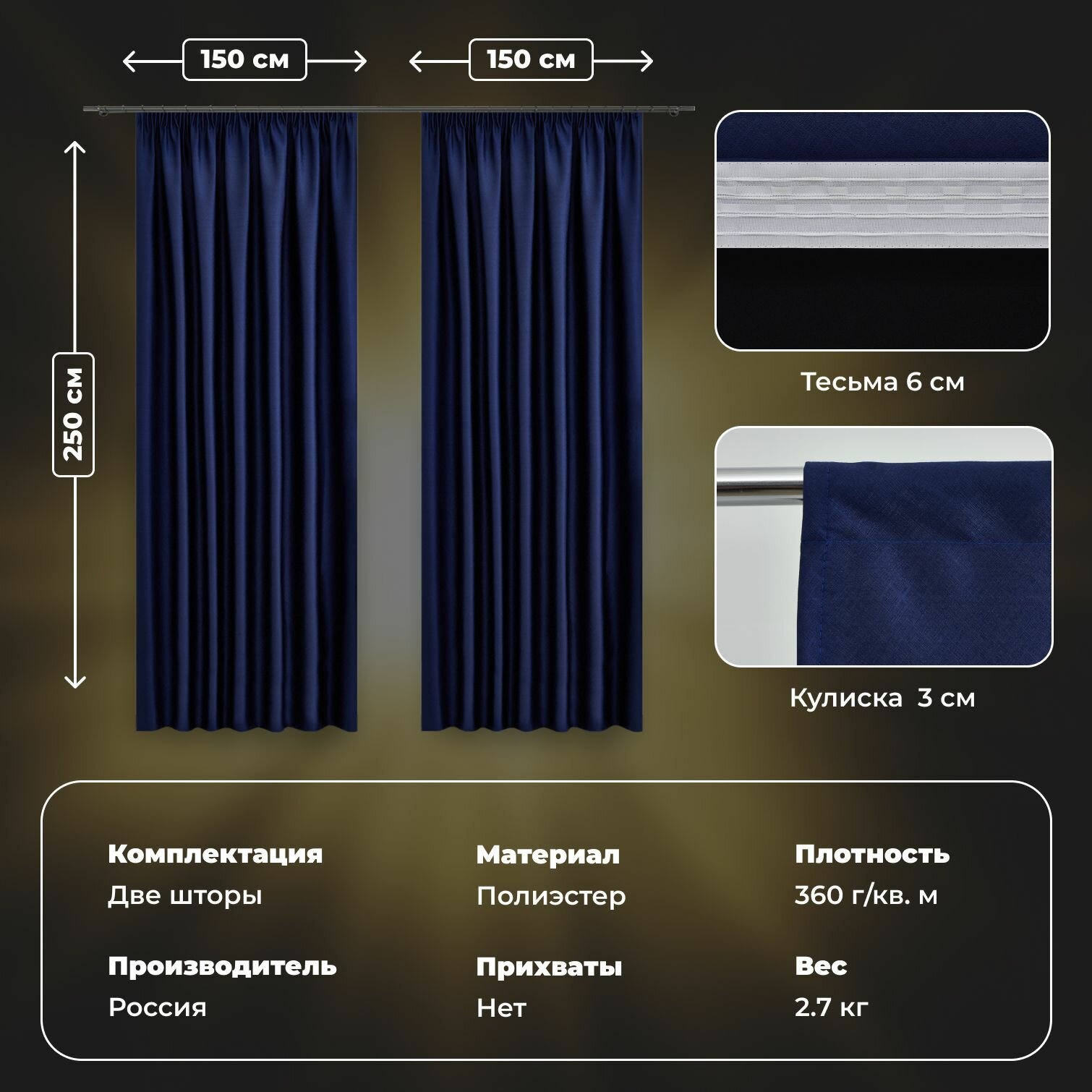 Комплект штор для комнаты Shtoraland Блэкаут 100%, синий, 250x270 см - 2 шт, однотонные светонепроницаемые.