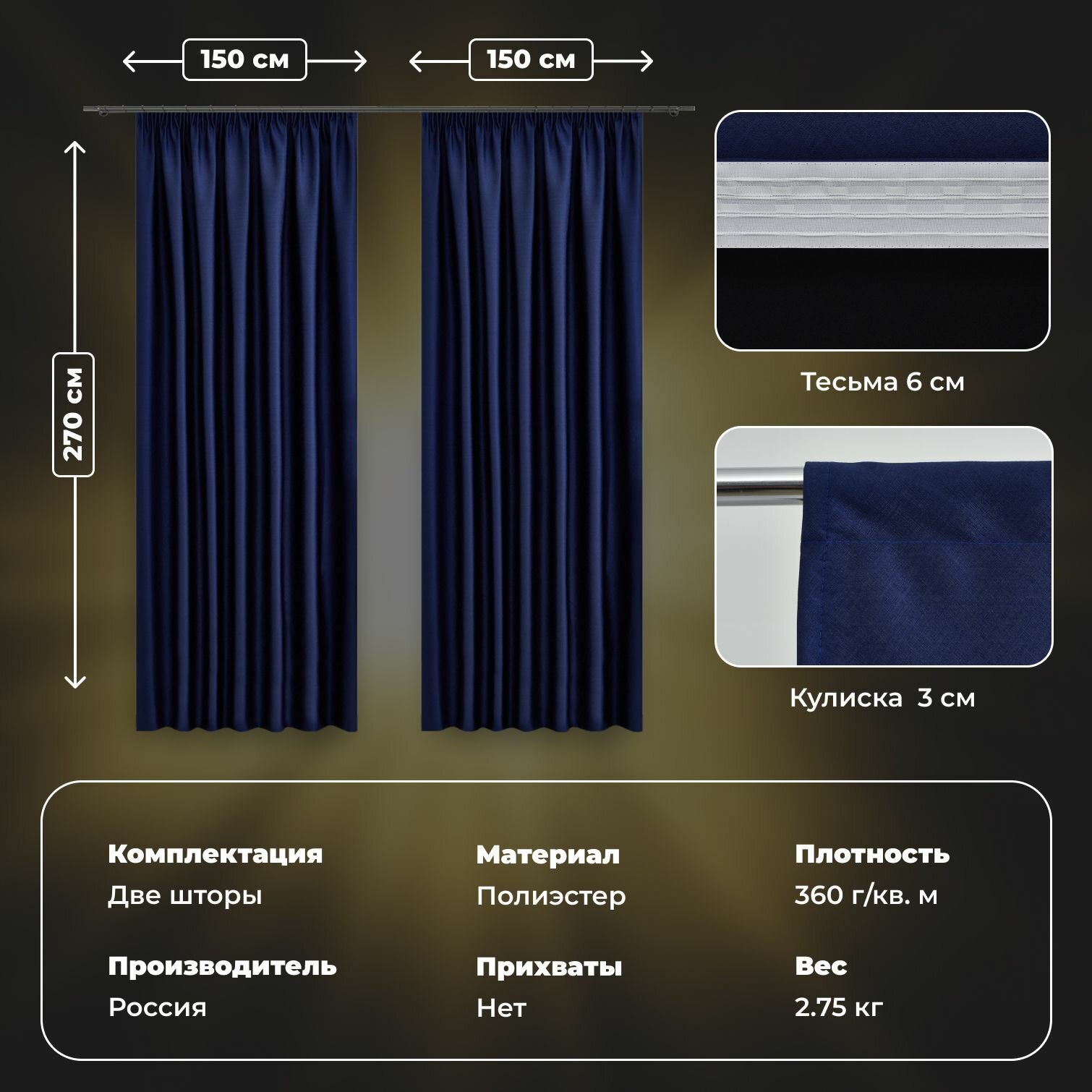 Купить Комплект штор для комнаты Shtoraland Блэкаут 100%, синий, 150x270 см - 2 шт, однотонные светонепроницаемые.