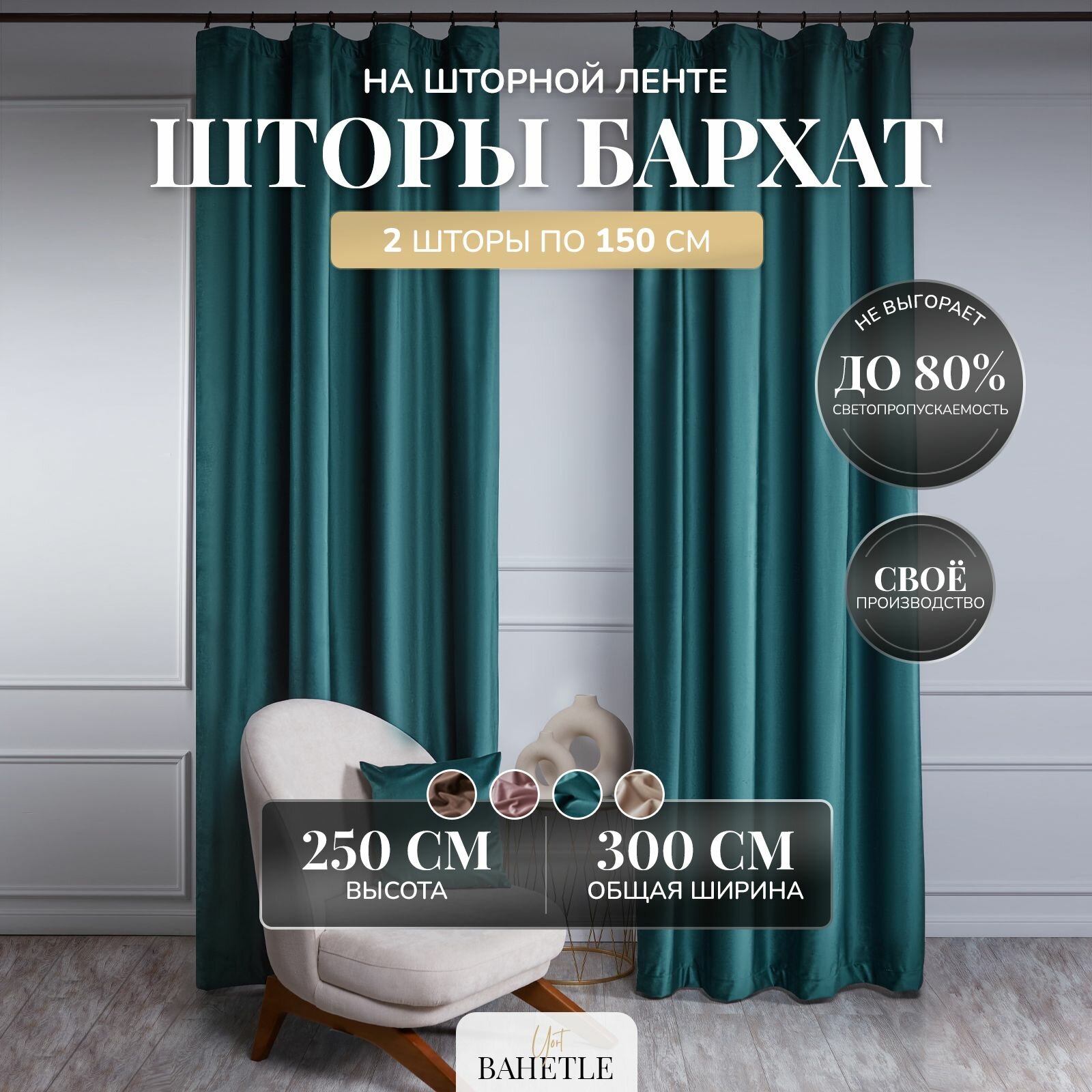СохранитьКомплект штор Bahetle Бархат велюр 150х250 см 2 шт, готовые портьеры димаут на ленте для комнаты, кухни, гостиной, зала однотонные изумрудные интересное: