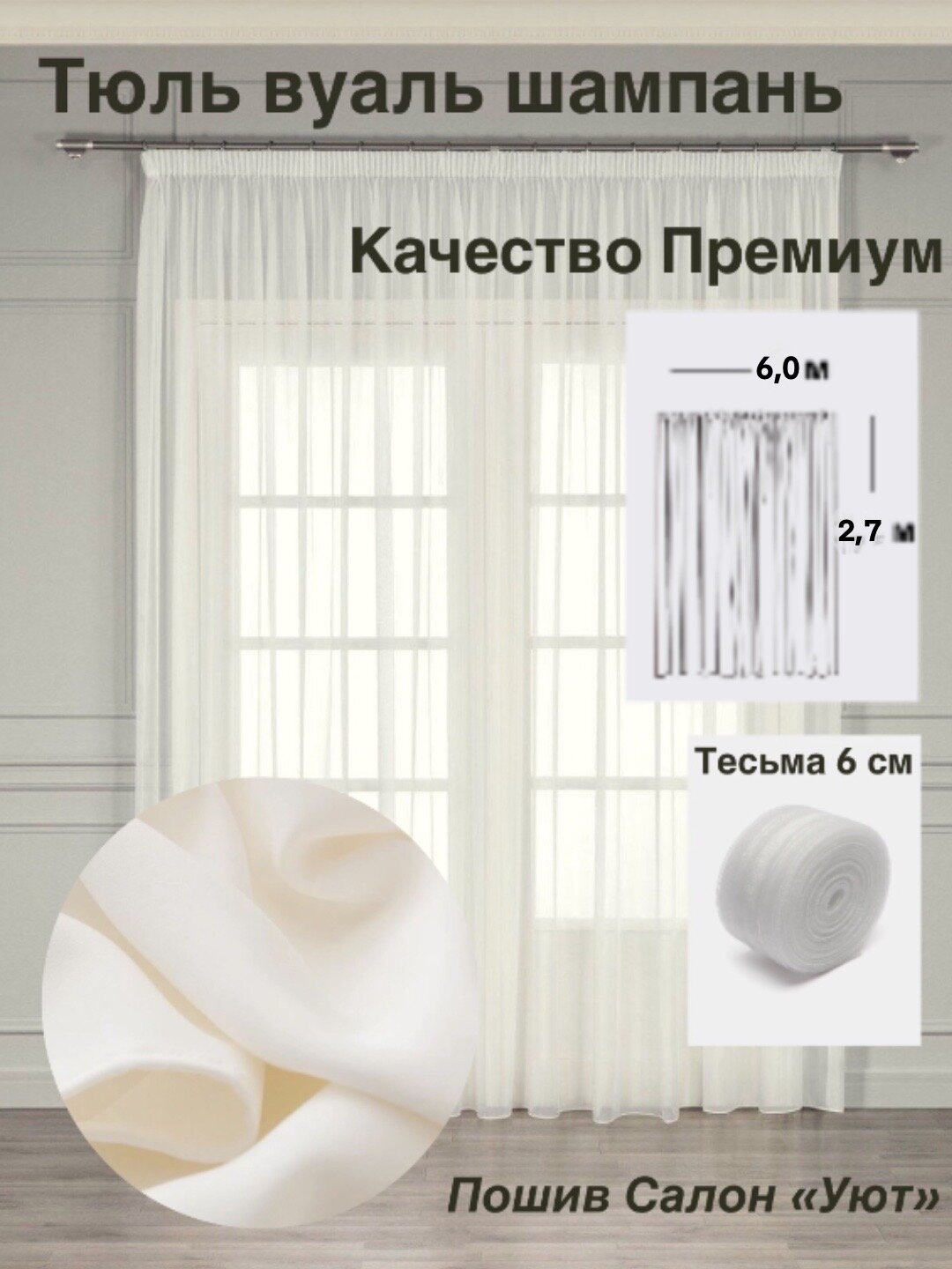 Тюль "Премиум" / 1 шт / 600*320 см / для гостиной, спальни, дома, дачи / ткань вуаль / шампань