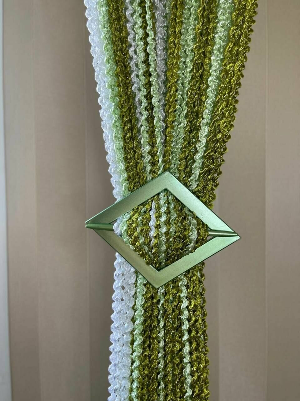 СохранитьНитяные шторы кисея, тюль спиральки макарони для кухни зеленые белые салатовые 300x300 см интересное:
