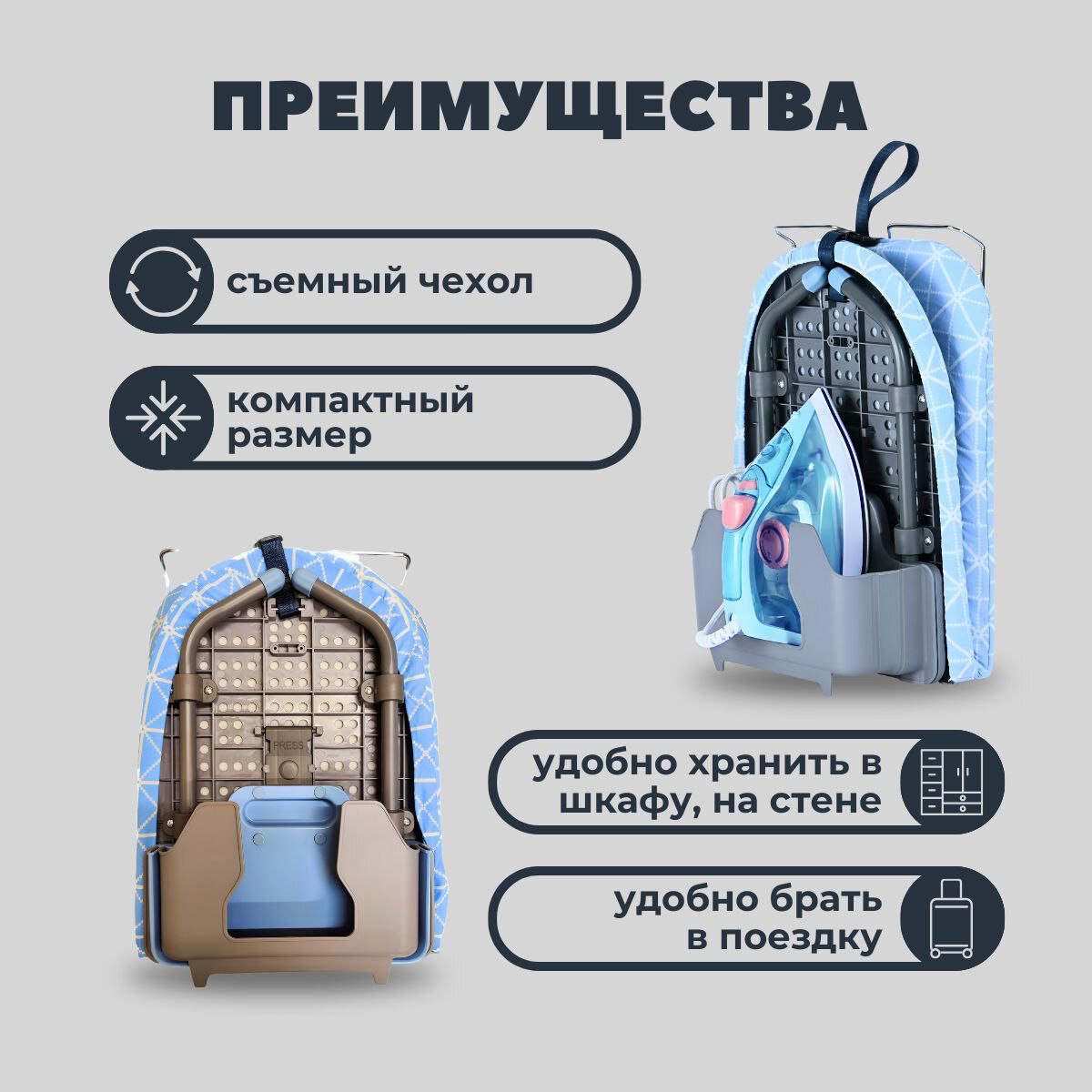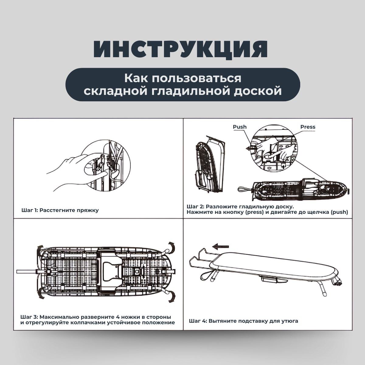 | Подробная комплектация | Гладильная доска настольная складная, чехол, держатель для утюга, органайзер для хранения утюга |