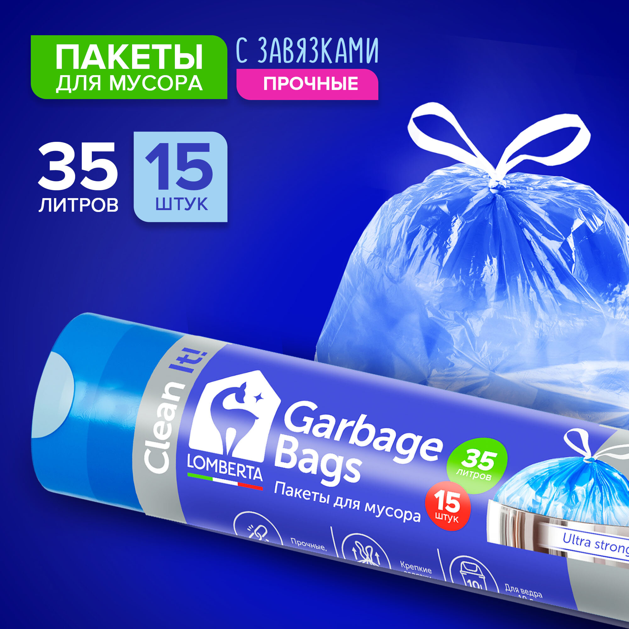 Мешки для мусора Lomberta, прочные с завязками, 35 литров, в рулоне 15 шт