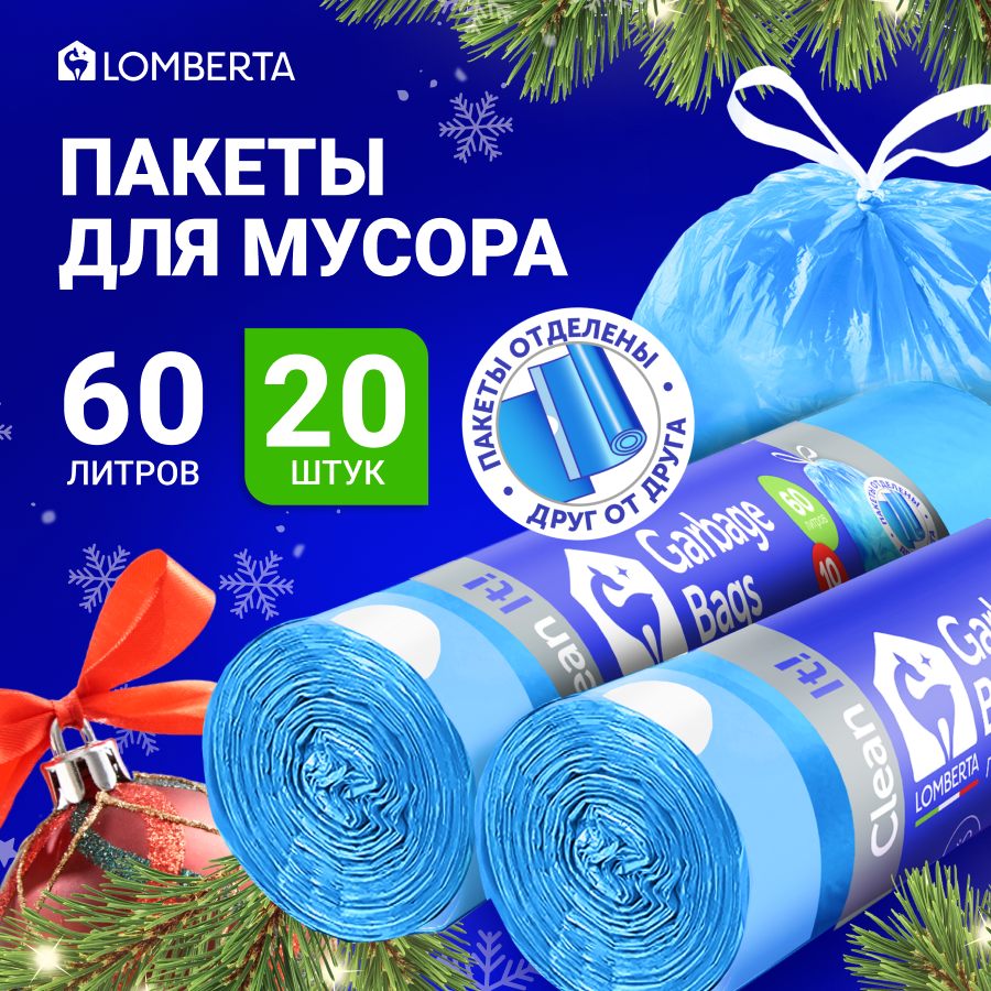 Мешки для мусора Lomberta 60 л, 20 шт, плотные с завязками, пакеты уже оторваны друг от друга и сложены в рулон