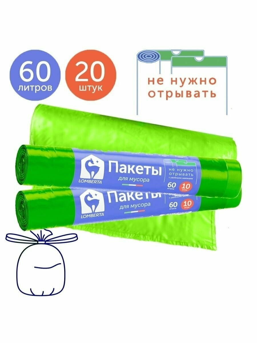 Мешки для мусора Lomberta 60 л, 20 шт, плотные с завязками, пакеты уже оторваны друг от друга и сложены в рулон