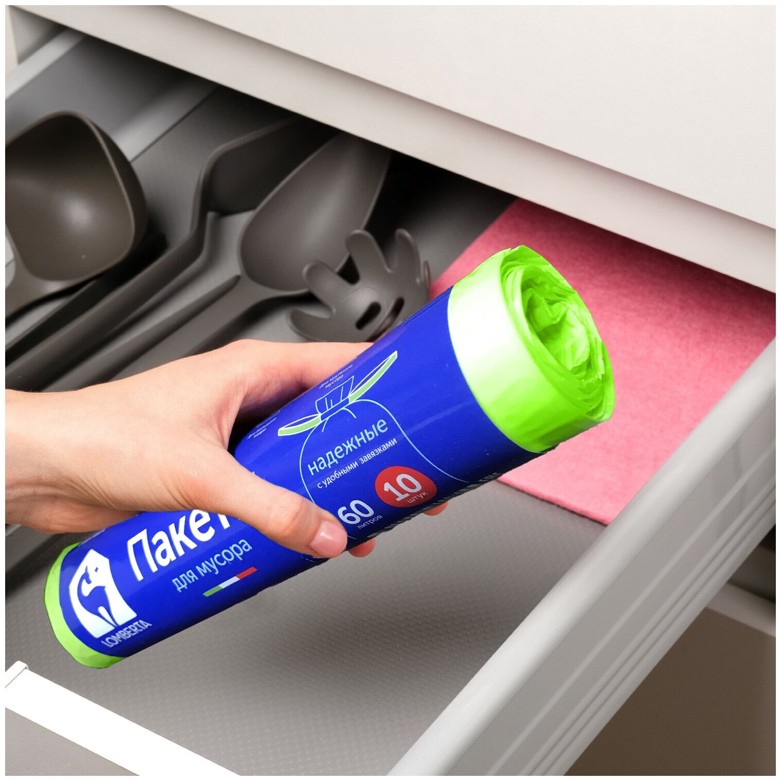 Мешки для мусора Lomberta 60 л, 10 шт, плотные с завязками, пакеты уже оторваны друг от друга и сложены в рулон