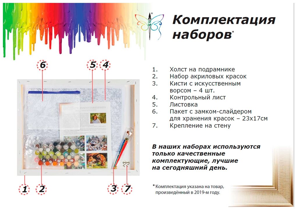 | Отзыв: | Очень красивый сюжет, размер 40?50 хорош, краски свежие, яркие, израсходовались на треть , некоторые на половину. Кисти свои, те что в комплекте не использовала. |