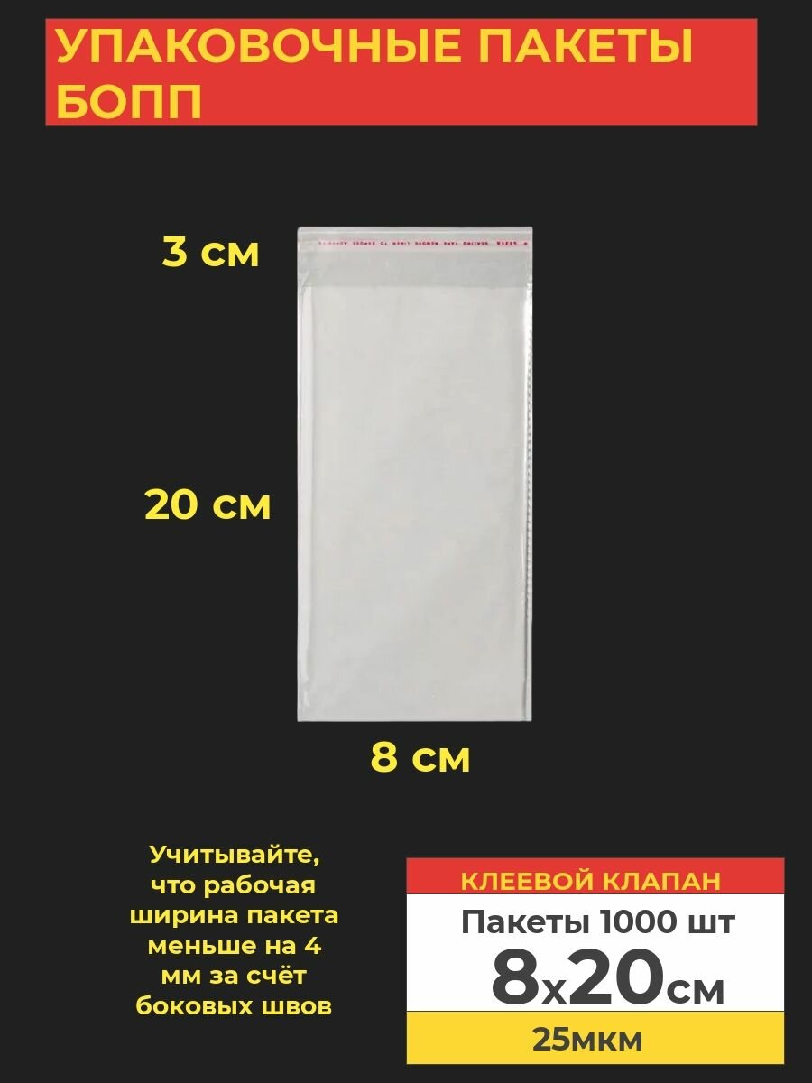 Купить Упаковочные бопп пакеты с клеевым клапаном, 8*20 см, 1000 шт.