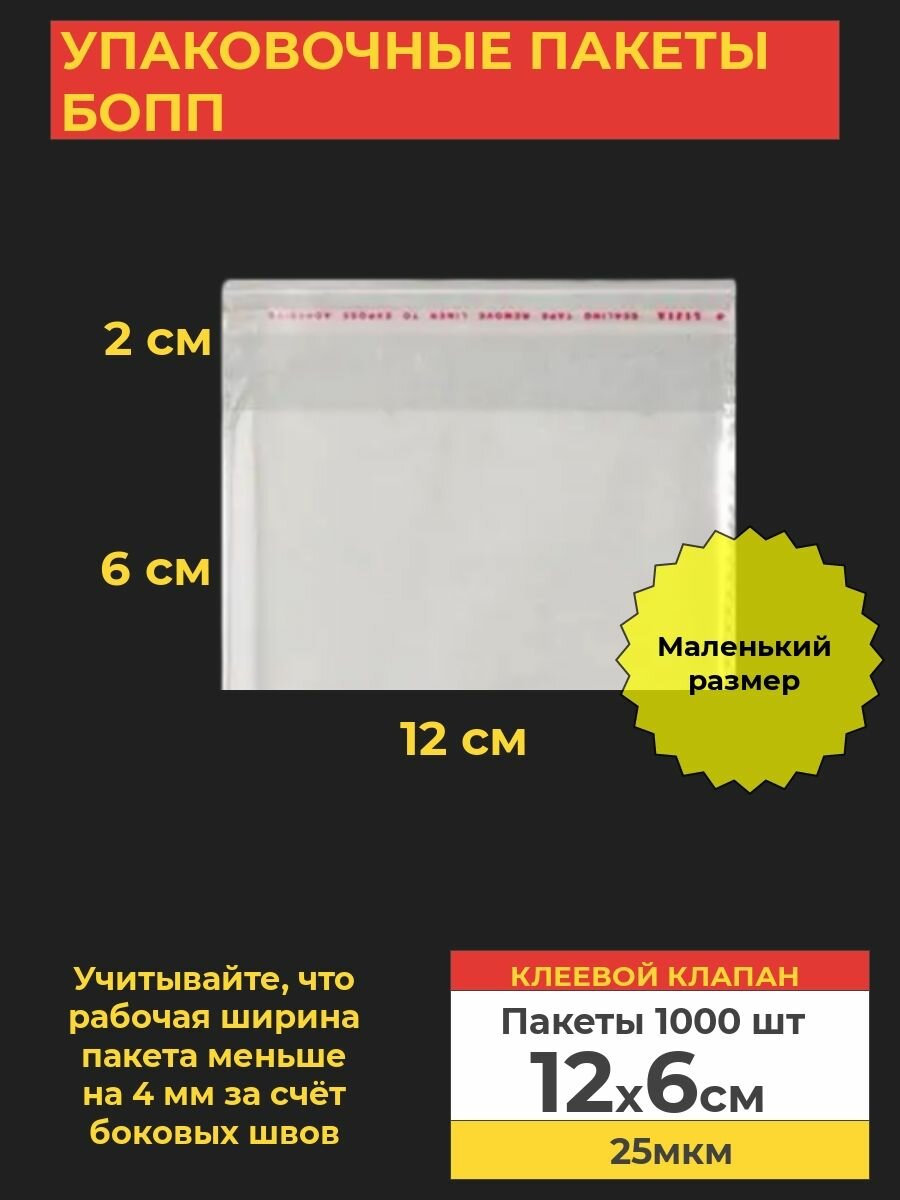 Купить Упаковочные бопп пакеты с клеевым клапаном, 12*6 см,1000 шт.
