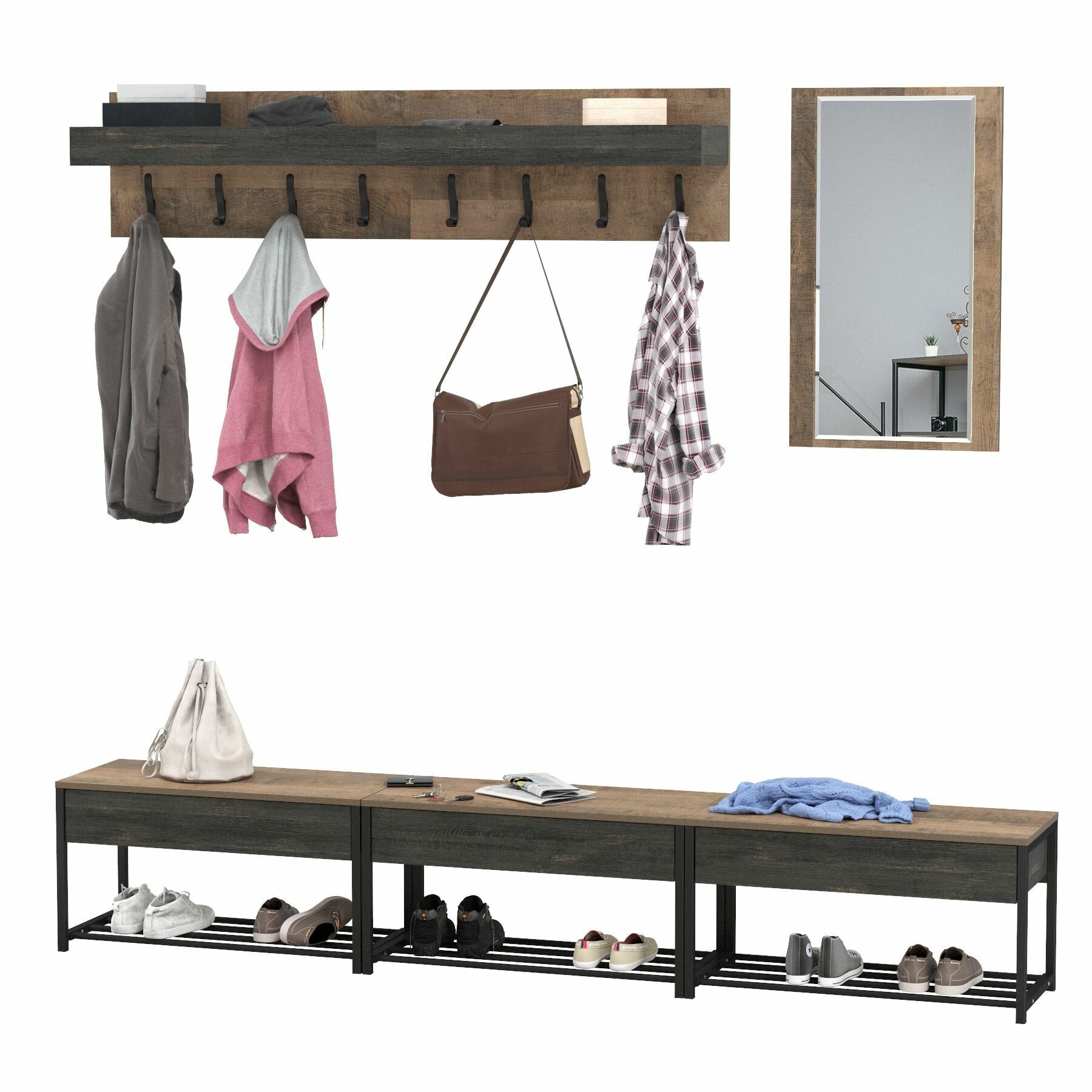 Прихожая комплект САША-6 (правая) от Фант-Мебель, с зеркалом, с обувницей, шкафом и ящиками, 156x203,6x43 см. Ясень темный/Ясень светлый