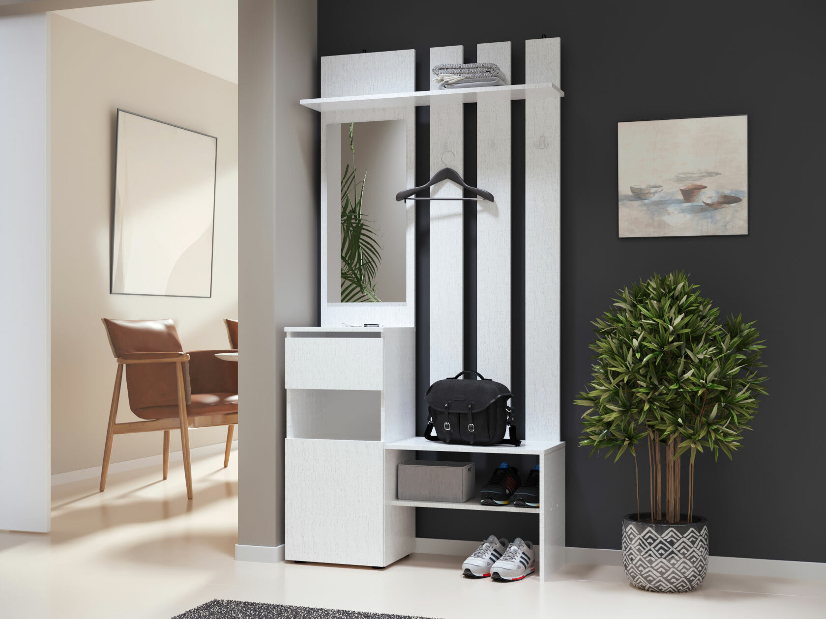 Прихожая комплект Тайлер с полками, с обувницей, с вешалкой, с зеркалом, 100.1х35.2х200 см, Белый текстурный