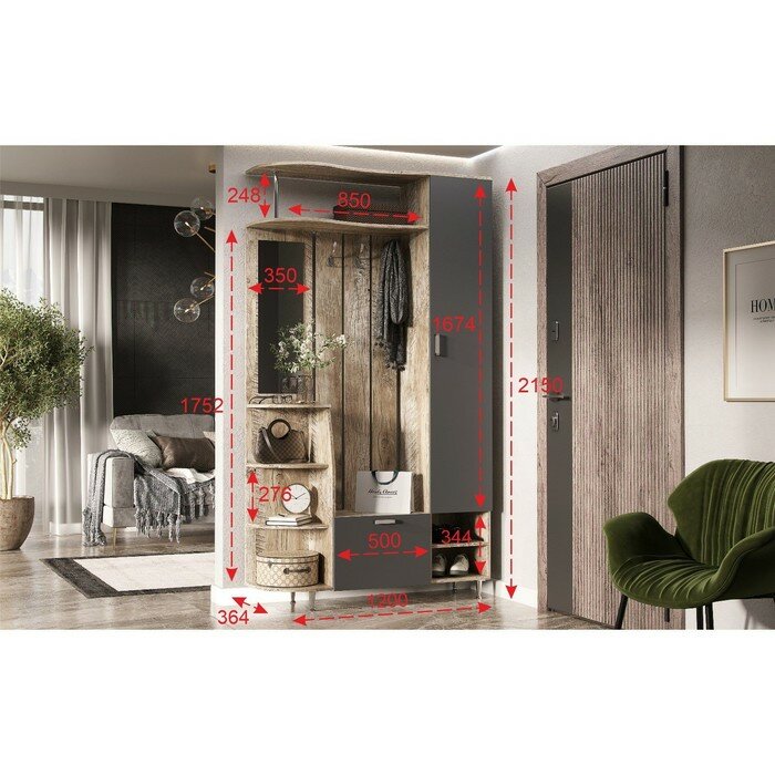 Прихожая Лика 2, 1200х364х2150, Дуб юкон/Графит 9224538