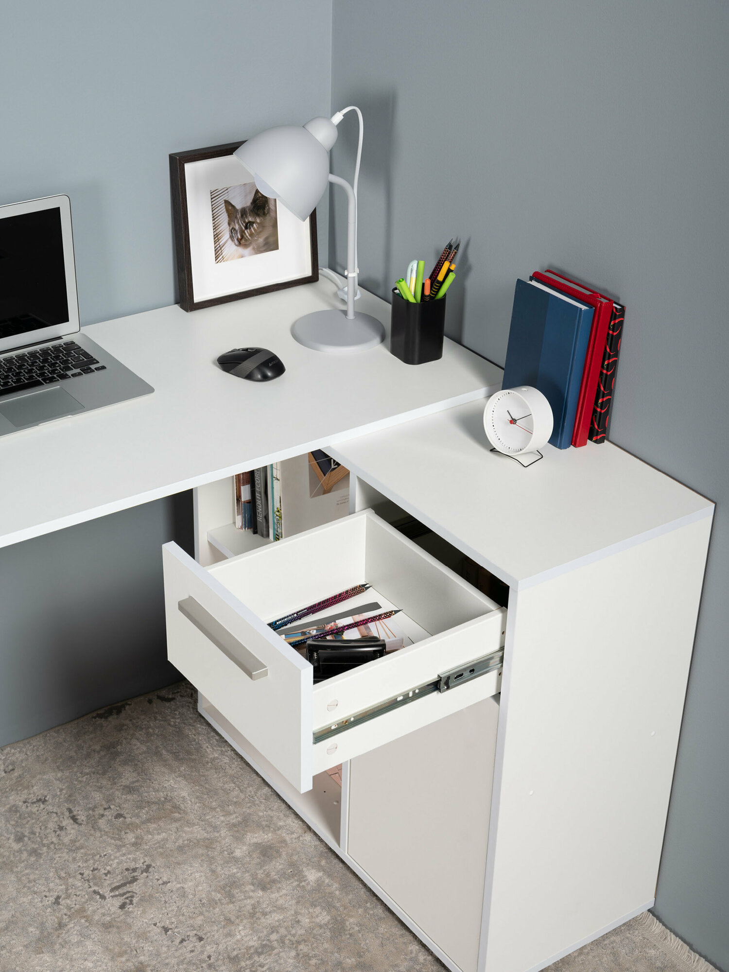 Угловой письменный компьютерный стол Санди 12.39 F с выдвижным ящиком и полками для хранения интересное: