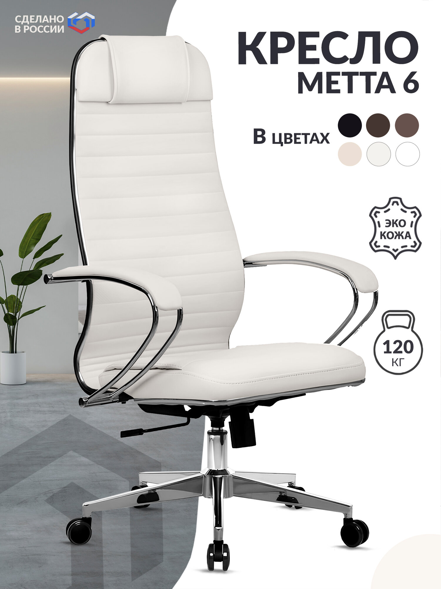 Кресло компьютерное Метта 6-2 на колесиках, с подлокотниками, высокой спинкой, подголовником, экокожа, белое / Стул ортопедический, 120 кг